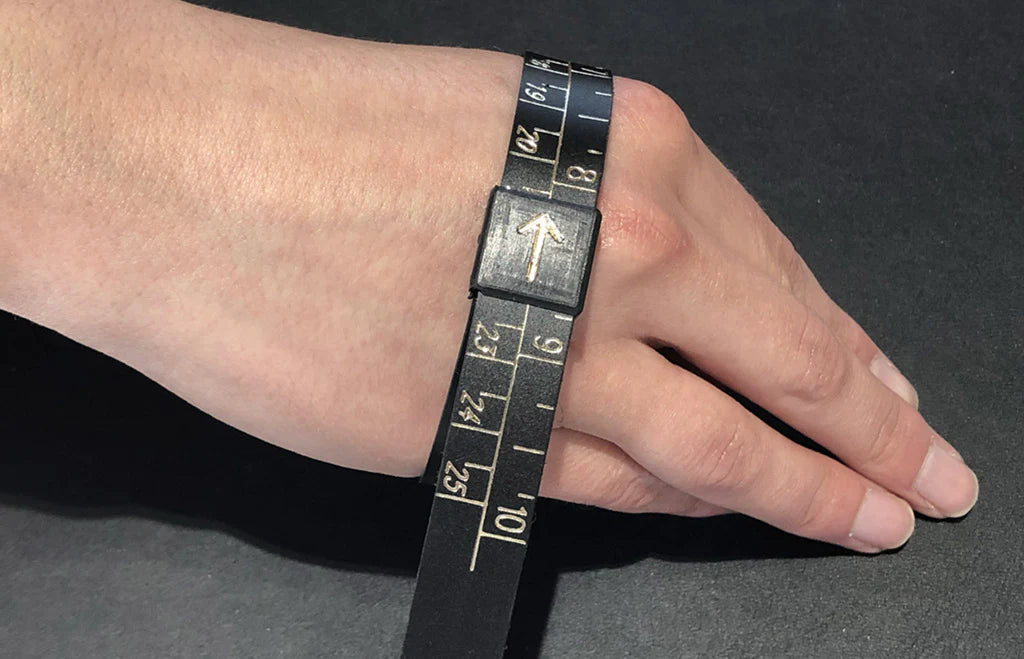 To find out what size bangle will slide over your hand/knuckles, first collapse your hand/knuckles as best you can, as shown in the photo above. Please use a flexible measuring tape, ribbon, or strip of paper. Wrap it snugly around your hand/knuckles at the widest point, as show in the image below.
