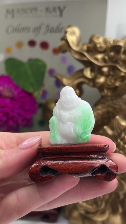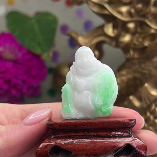 This green jade Buddha statue is a work of art. The light green jade is accented with bright apple green, creating a stunning contrast. The Buddha is depicted sitting on a wooden stand, adding elegance. Natural untreated A jade.