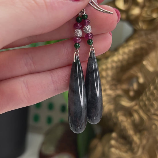Give yourself the gift of jade with these beautiful, long grey jade tear drop earrings set on 14K white gold with pink tourmaline roundels, dark green jadeite jade beads and 14K white gold bead accents. Guaranteed natural, untreated jade jewelry.