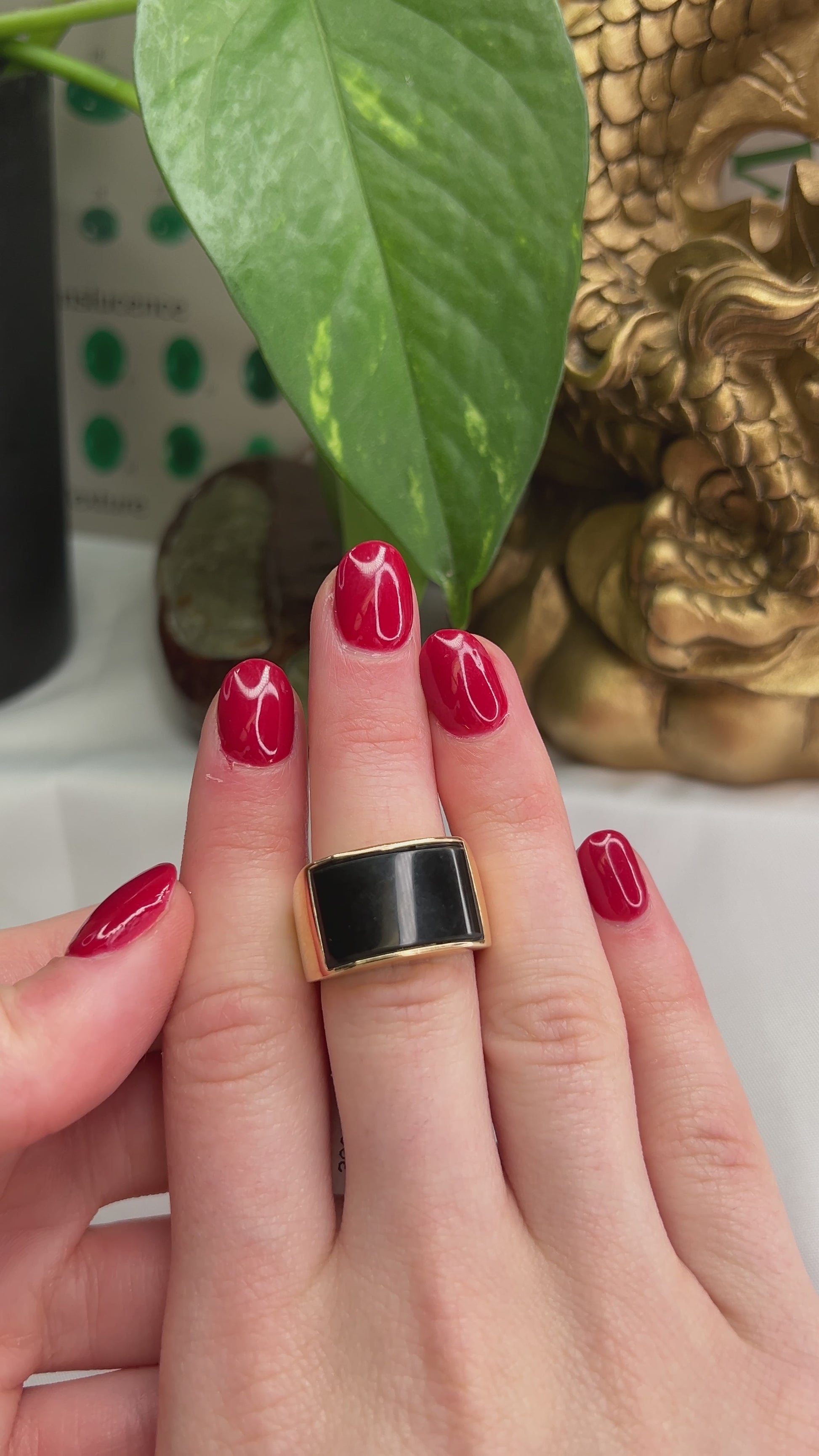 This 14K yellow gold black natural untreated nephrite jade saddle ring is a great gift for men and women alike. Nephrite jade is the toughest gemstone in the world and is a more durable alternative to other black gems. Finger size 7.