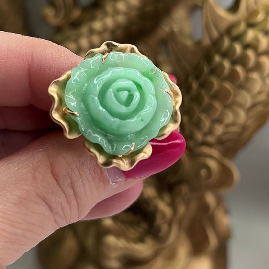 Genuine hand-carved apple green jadeite flower set in a satin finished 14K yellow gold petal mounting. Great conversation piece & stylish size 7 cocktail ring. Great color and design. Mason-Kay Gift Wrap & Certificate of Authenticity Included.