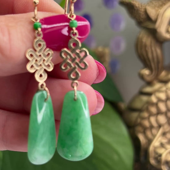 Green jade semi-flat drops from 14K yellow gold endless knots and green jade bead tops on shepherds hooks. The endless knot represents longevity and true love. Give these beautiful earrings to your true love. Natural untreated A jade.