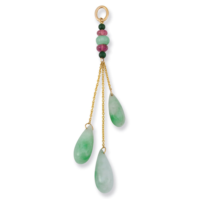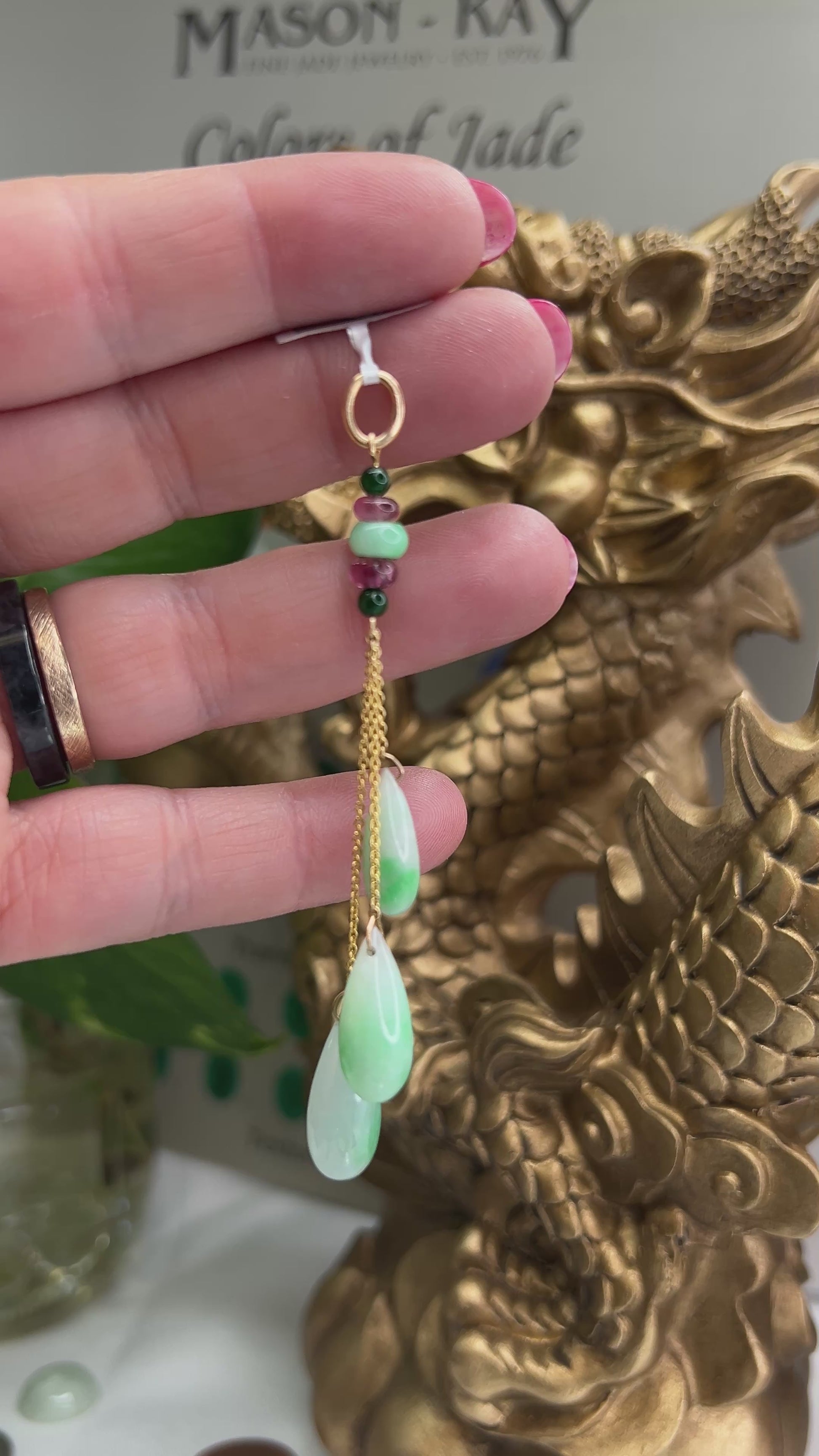 Get your jade on with these three green jadeite tears drop pendant with pink tourmaline accents. This is a wonderful piece to add to any jewelry collection. All Mason-Kay jade is natural, untreated A jade.