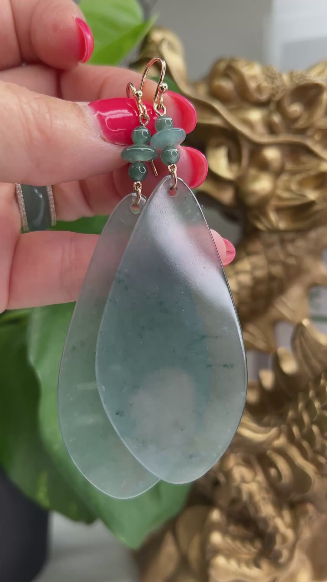 Amazing oversized, highly translucent, thin natural blue green jadeite jade free-form drop earrings set with green jadeite & 14K yellow gold accents. Not heavy to wear! So translucent you could read through them! Shop natural jade jewelry from Mason-Kay Jade for your jade jewelry collection.
