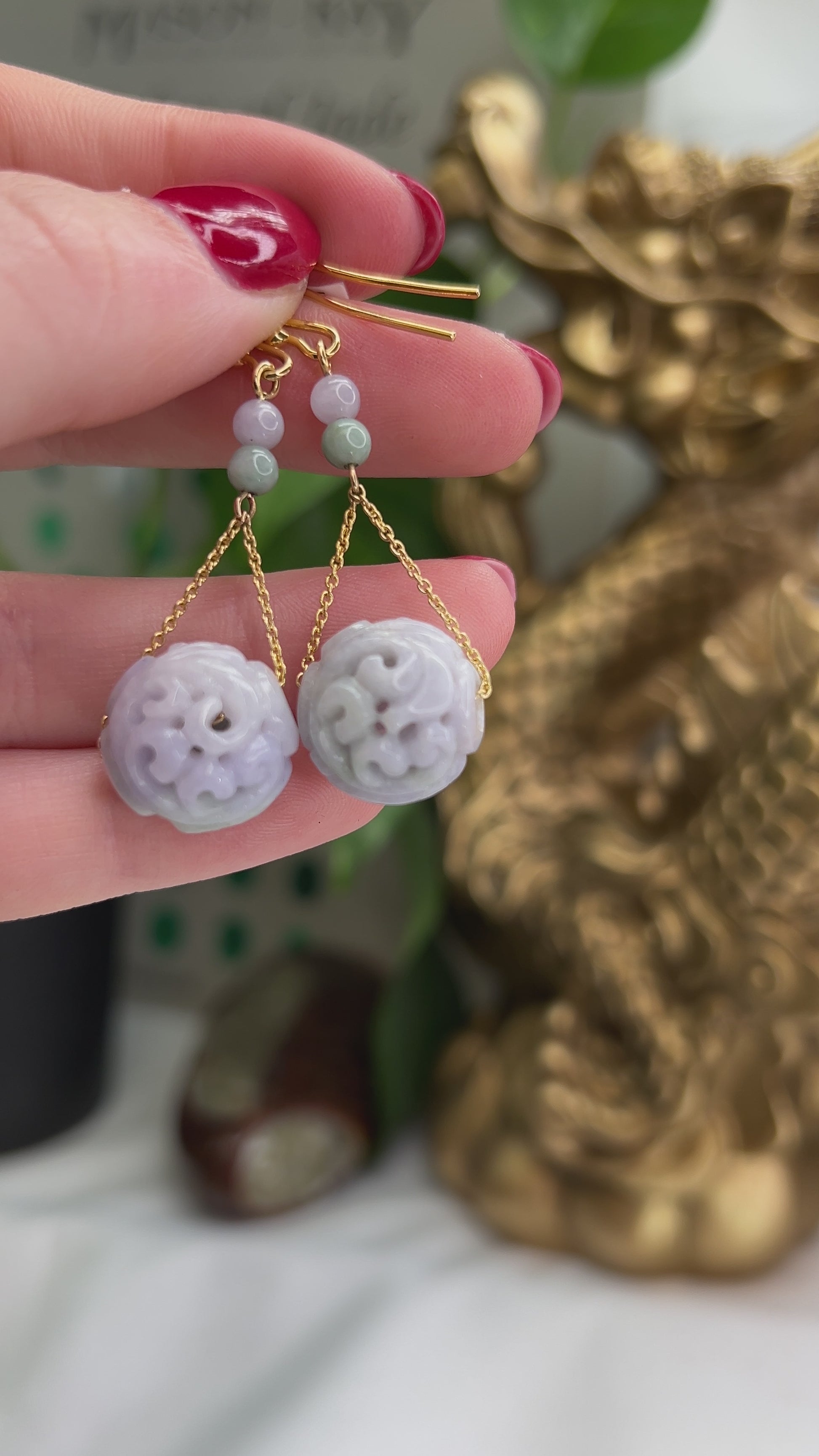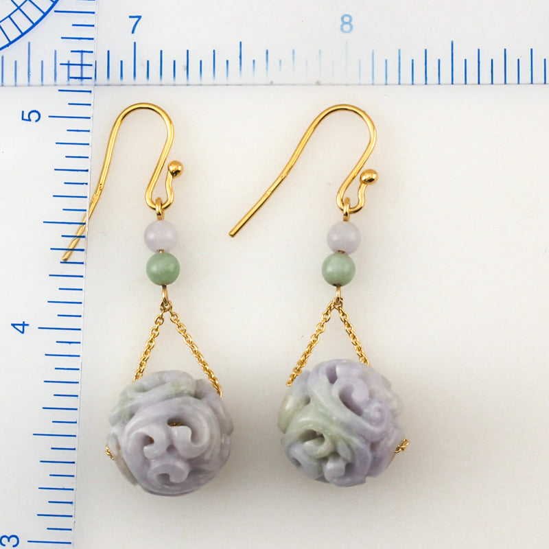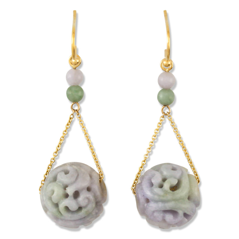 Carved jade beads combine with modern jewelry style in these green and lavender jade dangle earrings for women. Lightweight and easy to wear every day. Learn more about lavender jade here: Purple Jade Explained