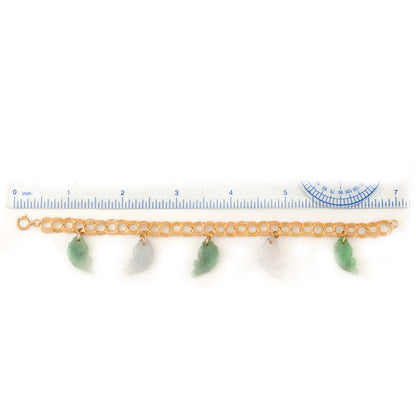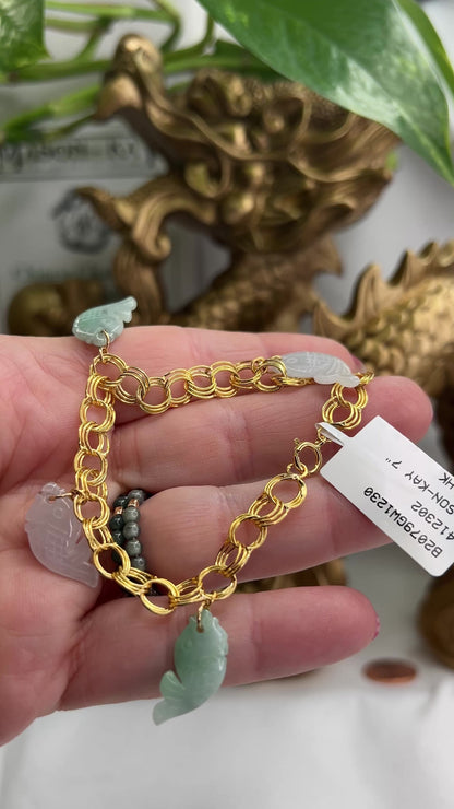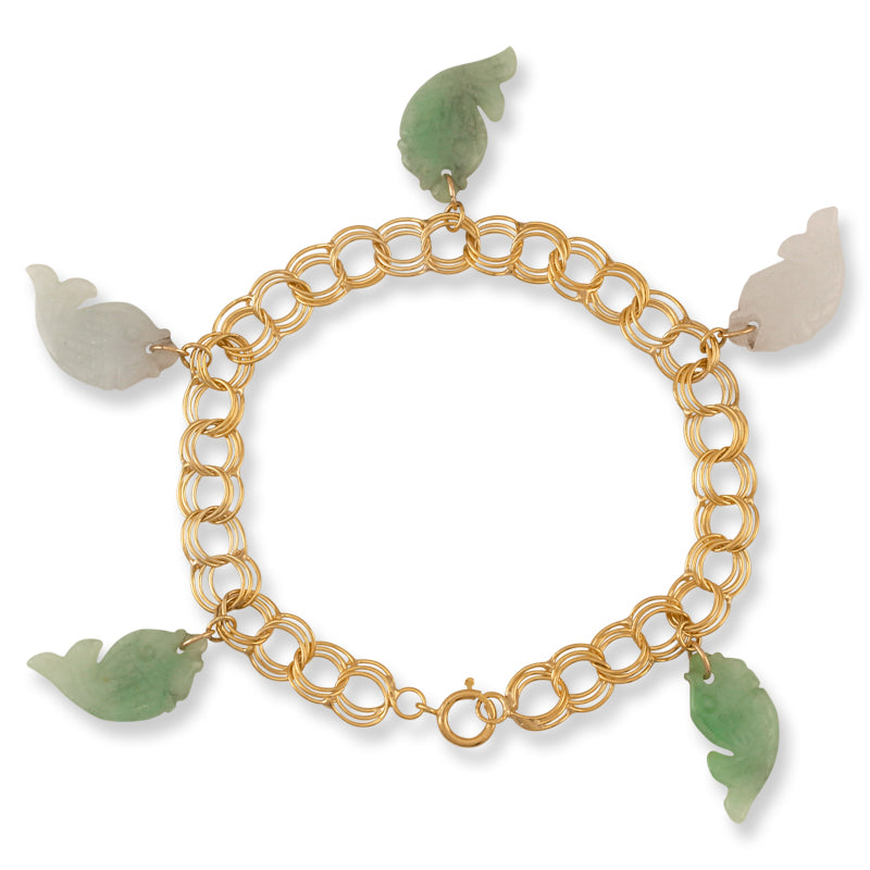 White and green jade fish carving bracelet in 14K yellow gold. Fish symbolize wealth and abundance, harmony and connubial bliss. Also, it is the symbol of regeneration and freedom. The fish is a most beloved and preferred symbol in Chinese culture, especially in art.