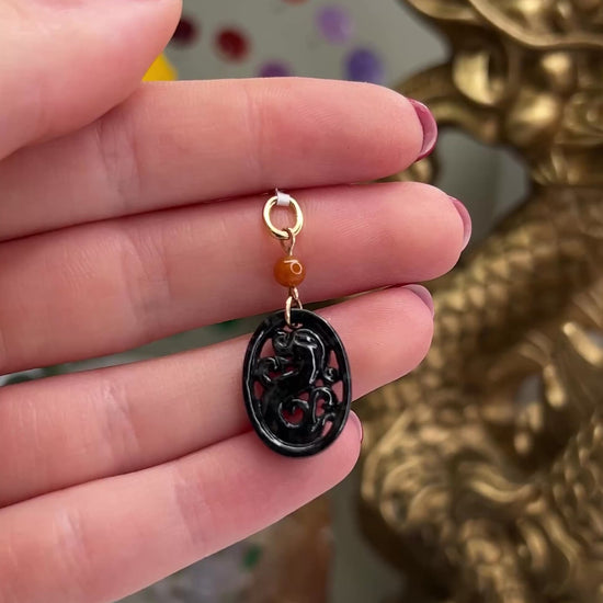 Black jade is known to symbolize protection, and this black jade dragon carving is accented by a red jade bead, associated with the element fire and represents power, celebration and good fortune.