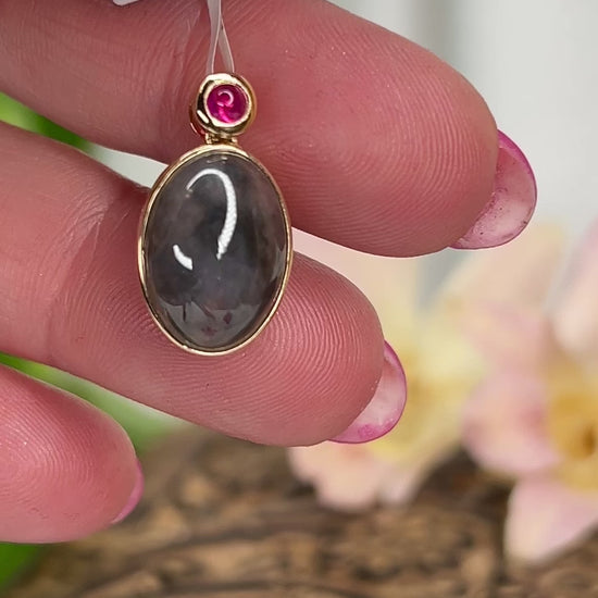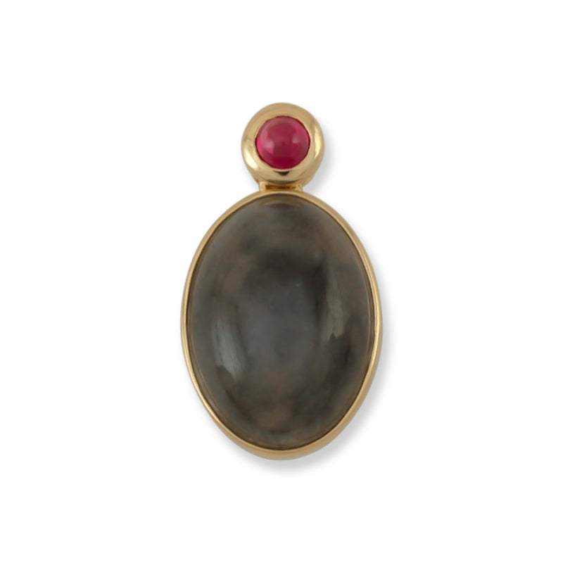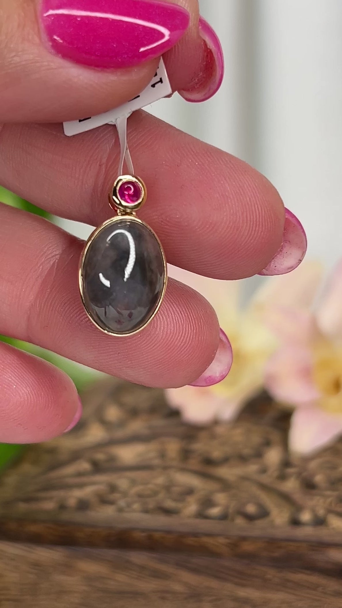 Classic style with a twist. This genuine grey jadeite oval cabochon is set in a 14K yellow gold pendant with a cabochon ruby top. Perfect jade piece to give or keep. Stylish look for either dress or casual. Gift wrap & certificate of authenticity!
