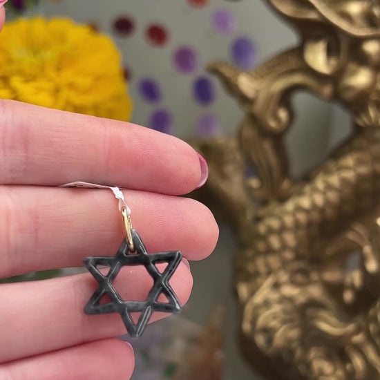 Hand-carved grey jadeite jade Star of David with a 14K yellow gold oval loop bail. This pendant is perfect for everyday wear. All Mason-Kay jade is natural, untreated type A Jadeite. Certificate of Authenticity & Gift Wrap Included.
