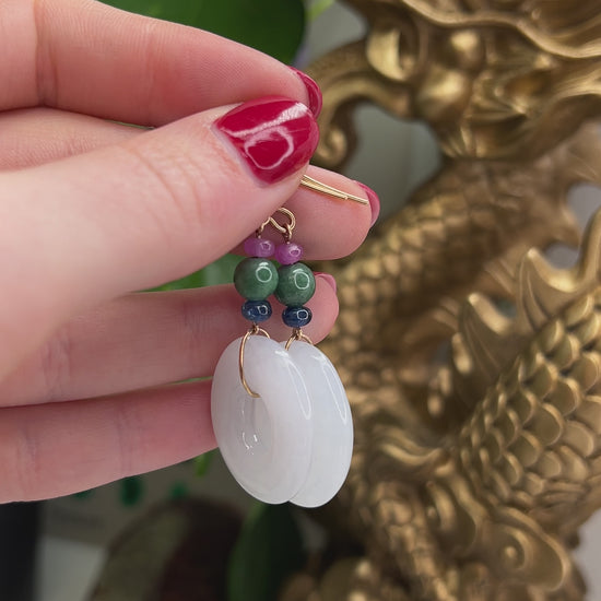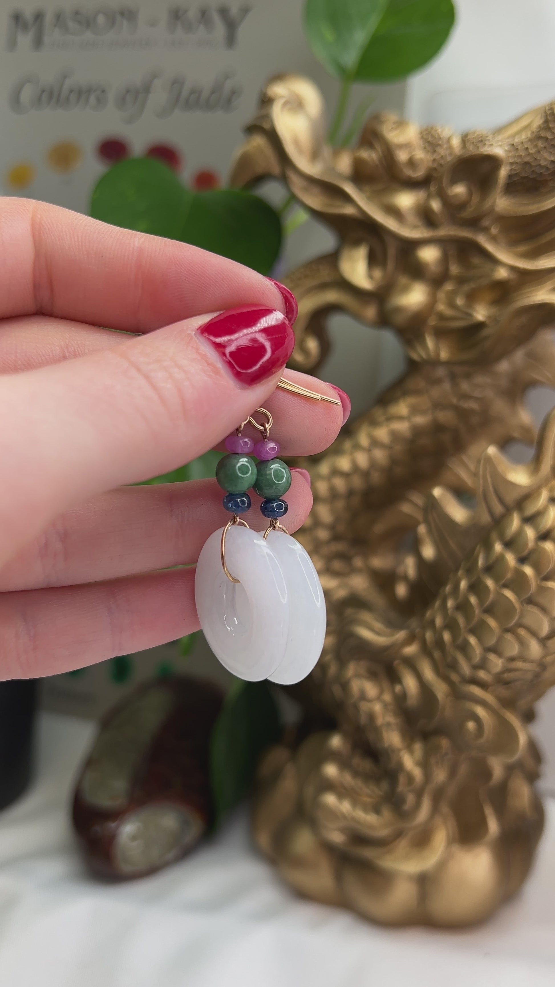 These icy white jadeite open oval earrings have blue & pink sapphires with green jadeite accents set in 14K yellow gold. Perfect with jeans or a cocktail dress. All Mason-Kay jade jewelry is certified natural untreated type A jadeite. Amazing Gift!