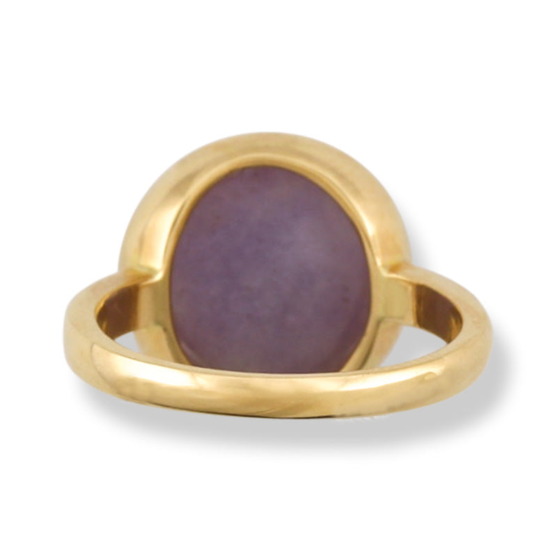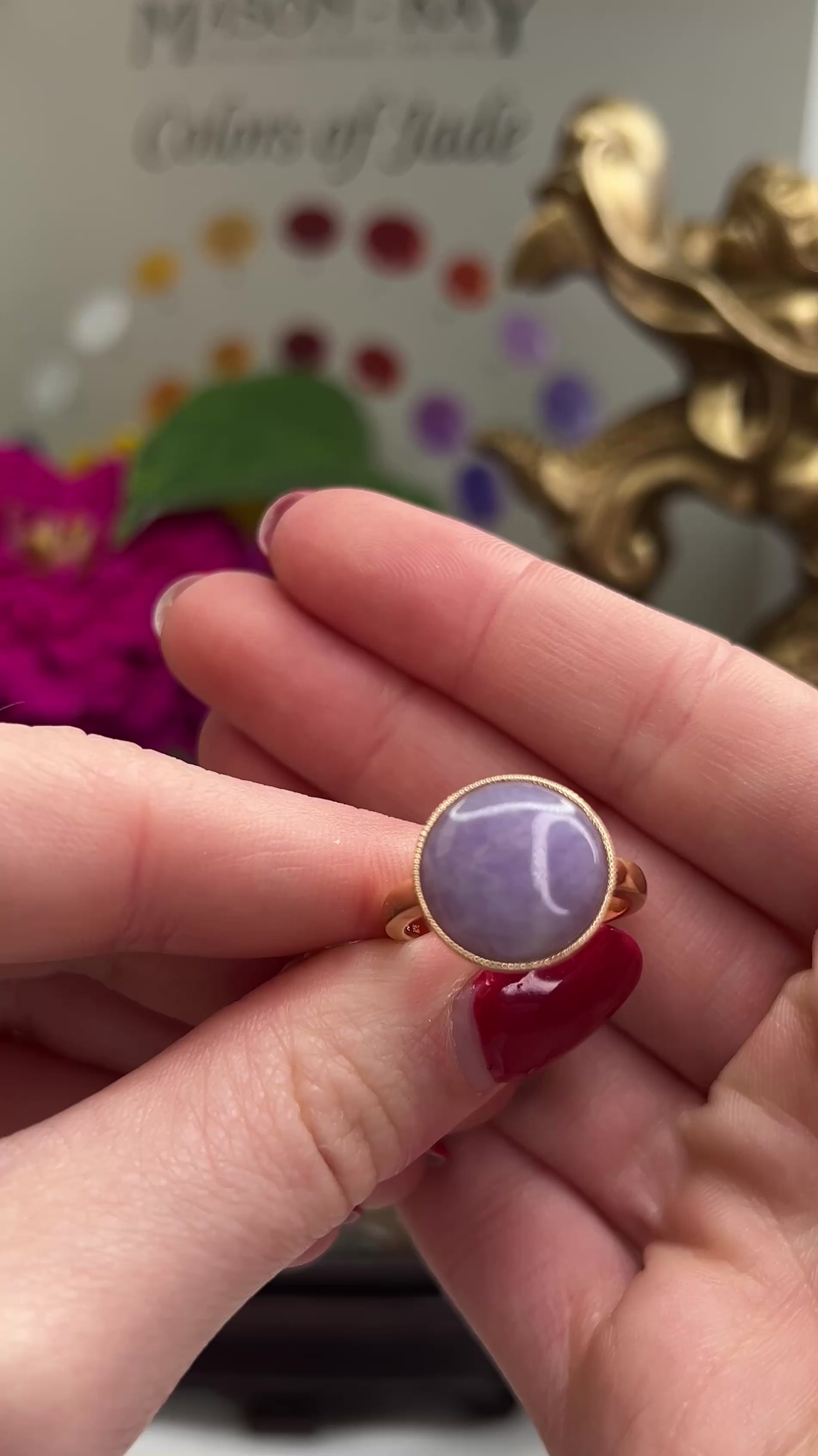 Featuring a genuine round lavender jadeite jade cabochon, this righthand ring for women showcases a 14K yellow gold bezel with elegant milgrain detailing. A finger size 7, this fashion ring is perfect for daily wear. Enhance your jade collection with this stunning and timeless piece today.