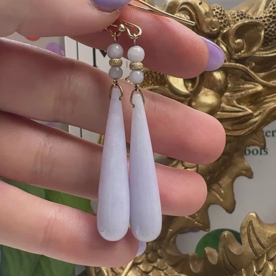 Gorgeous long lavender jadeite tear drops with lavender jadeite bead accents and 14K yellow gold stardust roundels and shepherds hooks. These amazing soft lavender jade earrings are a classic style with a touch of modern flare. These are a staple for and jade jewelry collection. Perfect for day or evening wear, casual or dressy. Shop natural jade jewelry from Mason-Kay Jade for your jade jewelry collection.