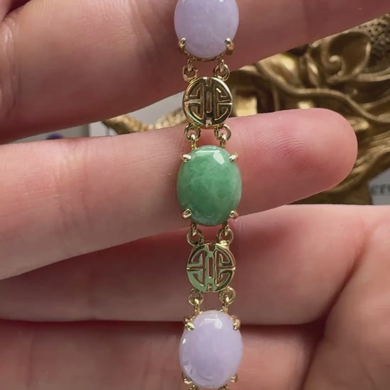 The Shou is a symbol for longevity in Chinese culture, making this multi-colored jadeite bracelet with 14k yellow gold Shou spacers the perfect meaningful addition to any jewelry collection. Bracelet measures 7.25 inches.