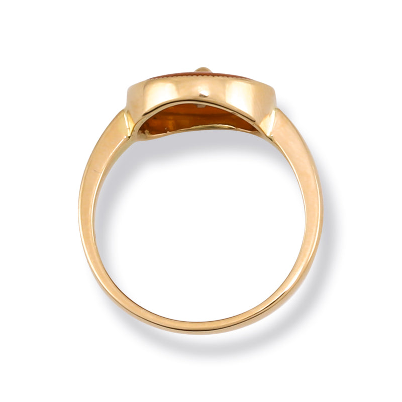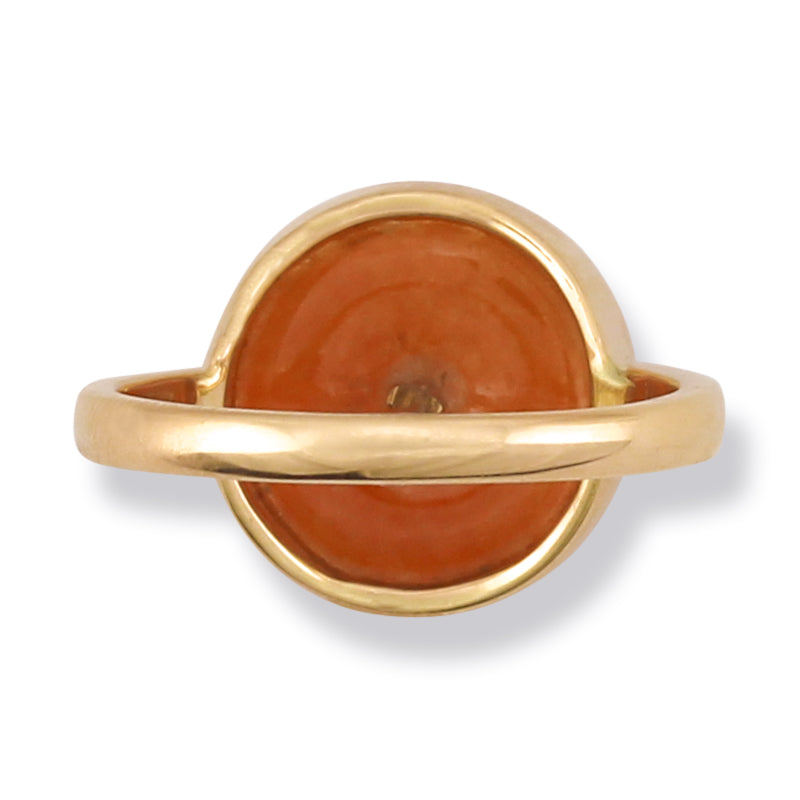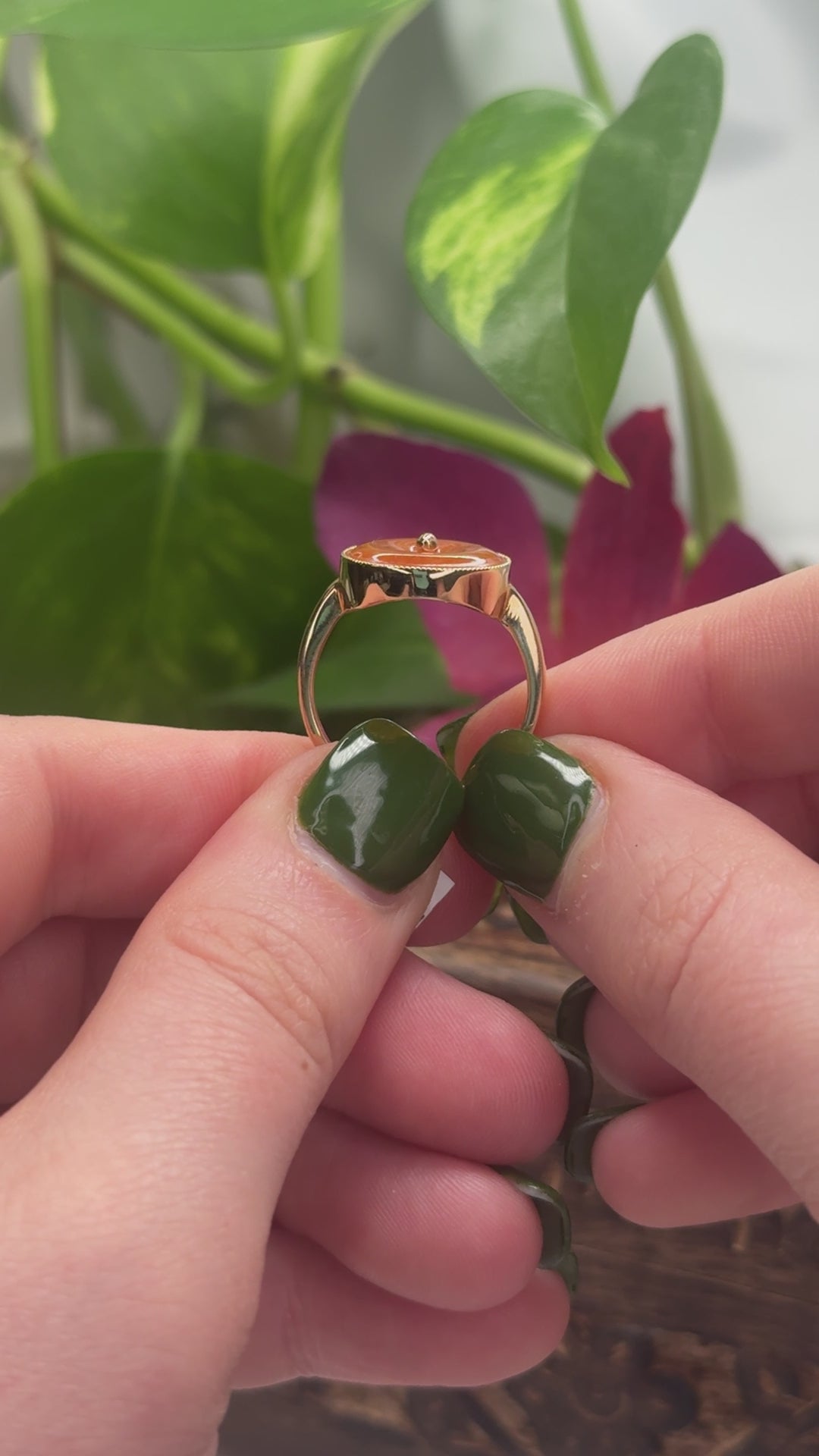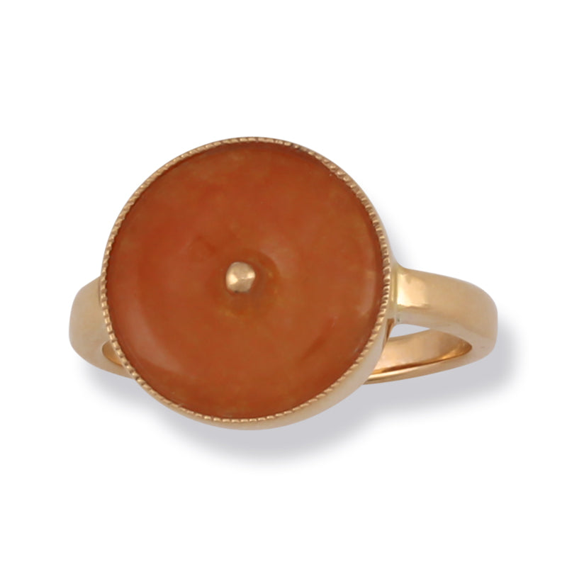 This red jade disc ring is milgrain bezel set in a 14K yellow gold mounting with a bead center. This ring is a great piece for everyday wear and is perfect for men and women alike. Finger size 7.25. Natural untreated A jade. Guaranteed!