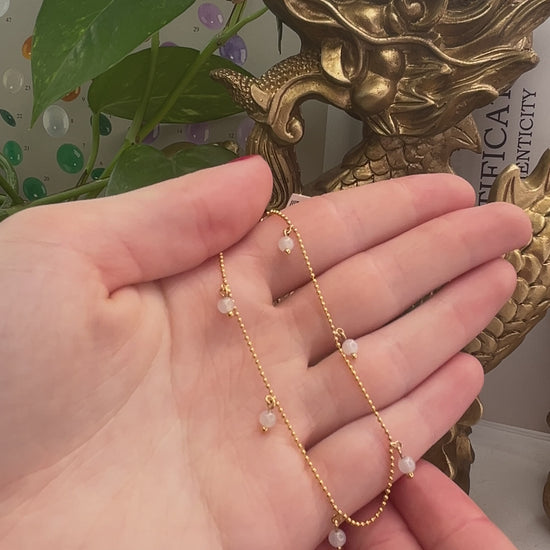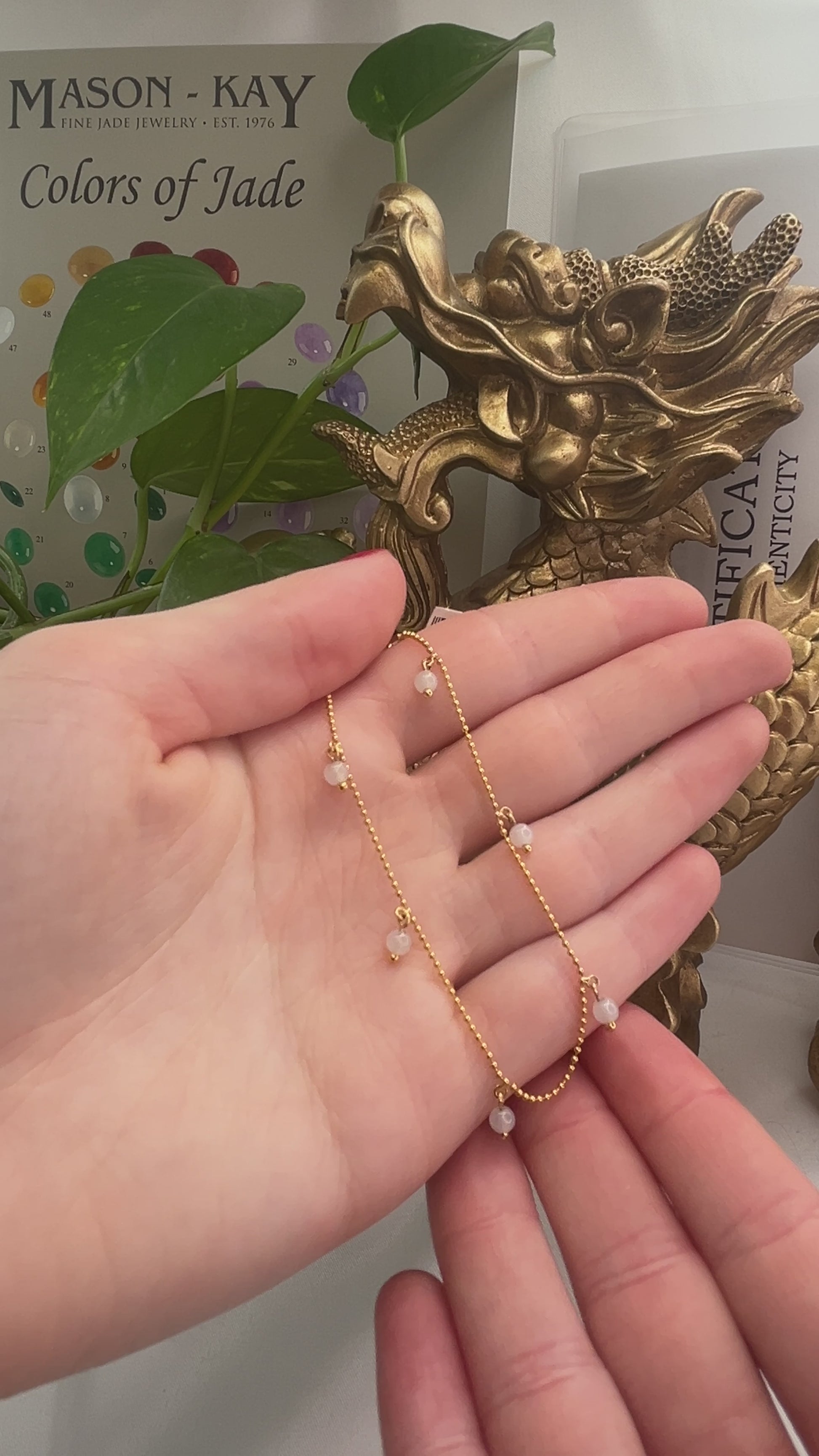 This sweet genuine white jadeite jade bead charm bracelet has 6 round jade bead charms on a 14K yellow gold chain with a lobster clasp. Perfect jade gift for everyday wear. Mason-kKy gift warp & authenticity report included.