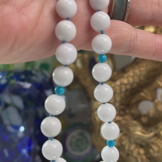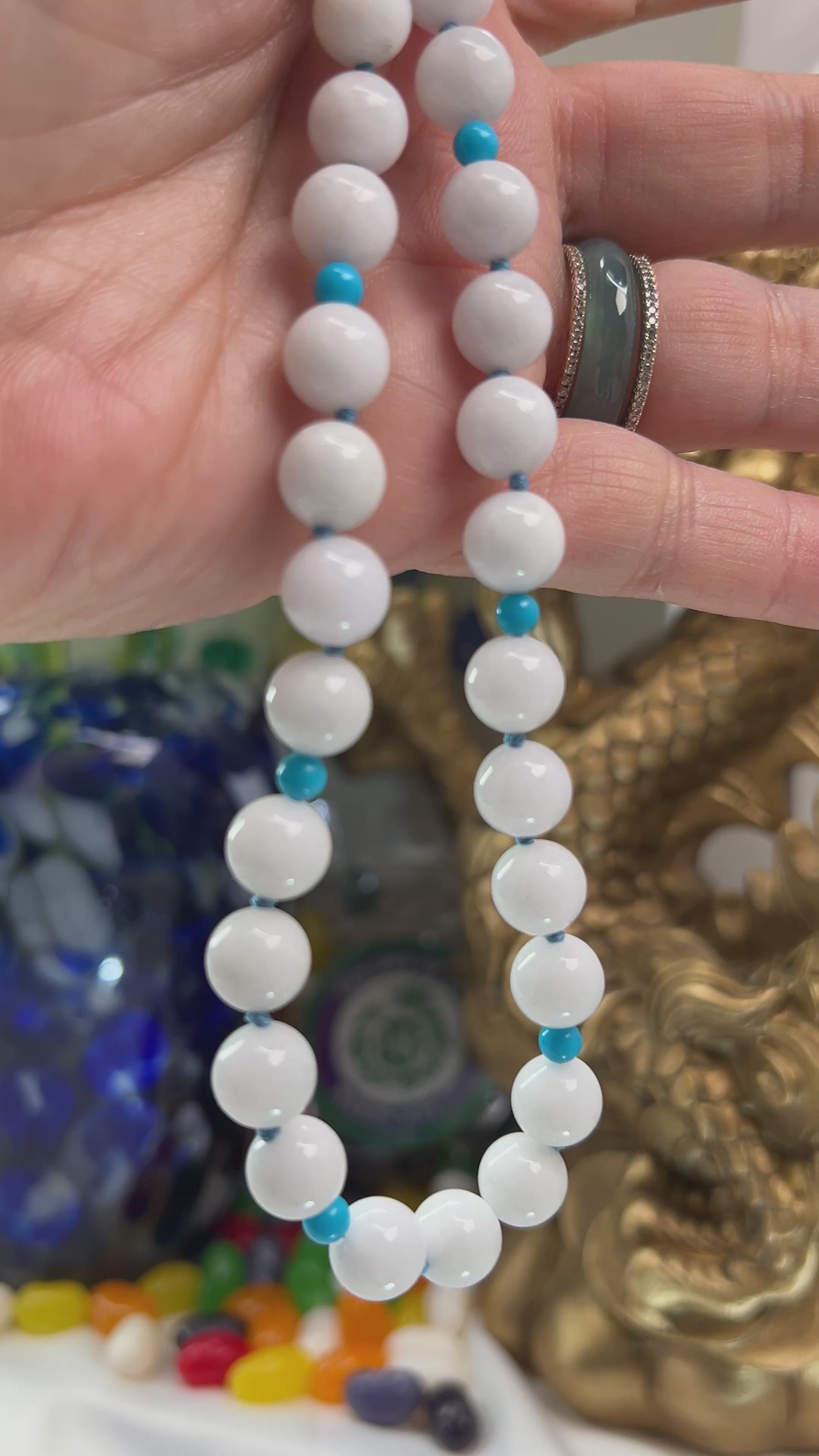 This necklace features 48 smooth white jadeite jade beads accented by striking round turquoise beads, all strung on a silky adjustable cord. The vibrant color contrast enhances its appeal, while the adjustable design ensures the perfect fit every time.