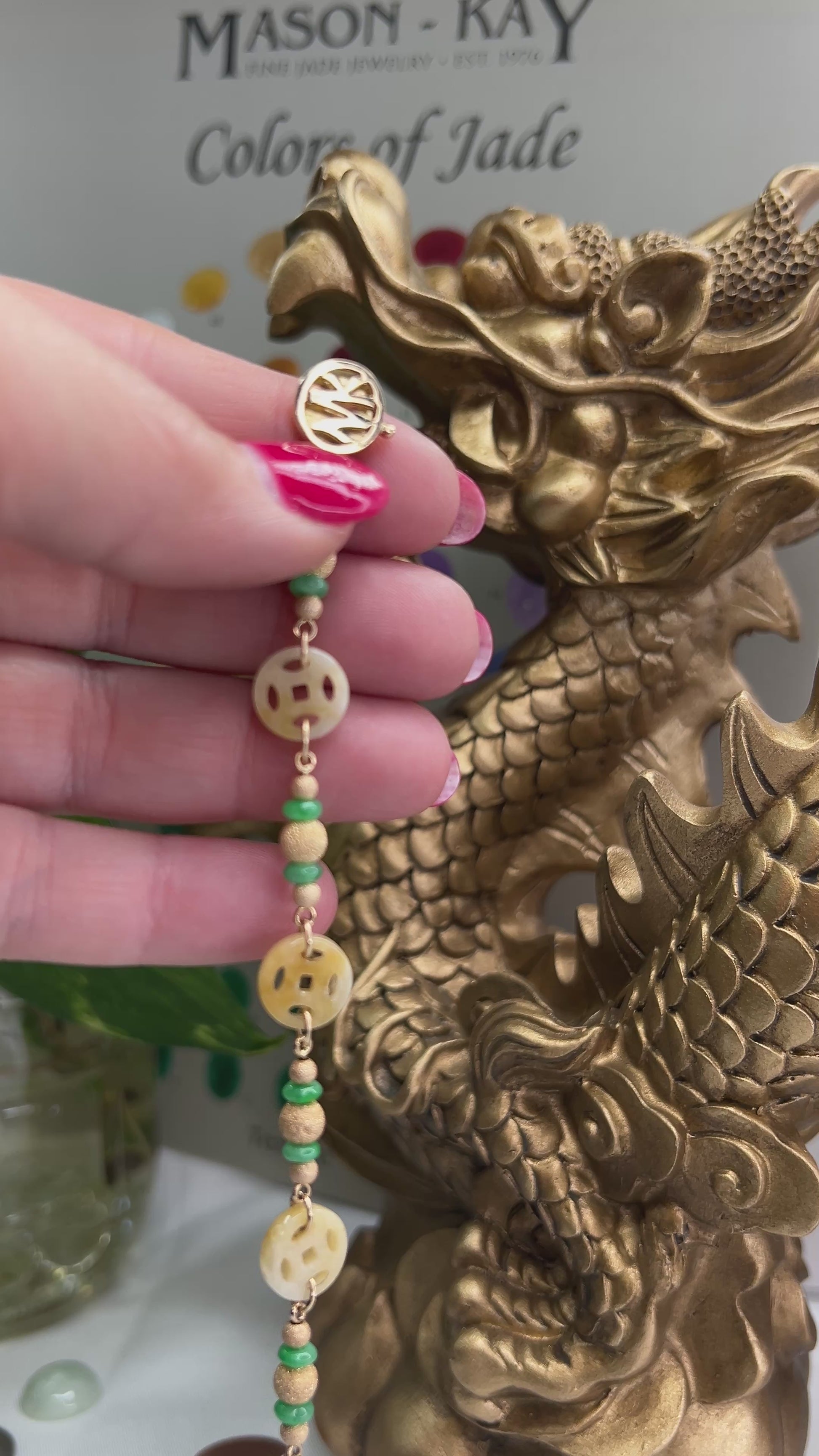 Yellow jade coin (10mm) bracelet with green jade roundel & 14K yellow gold stardust bead accents with our signature 14K yellow gold Mason-Kay clasp. The bracelet is 7 inches long. All Mason-Kay Jade is Guaranteed Natural Untreated Jade.