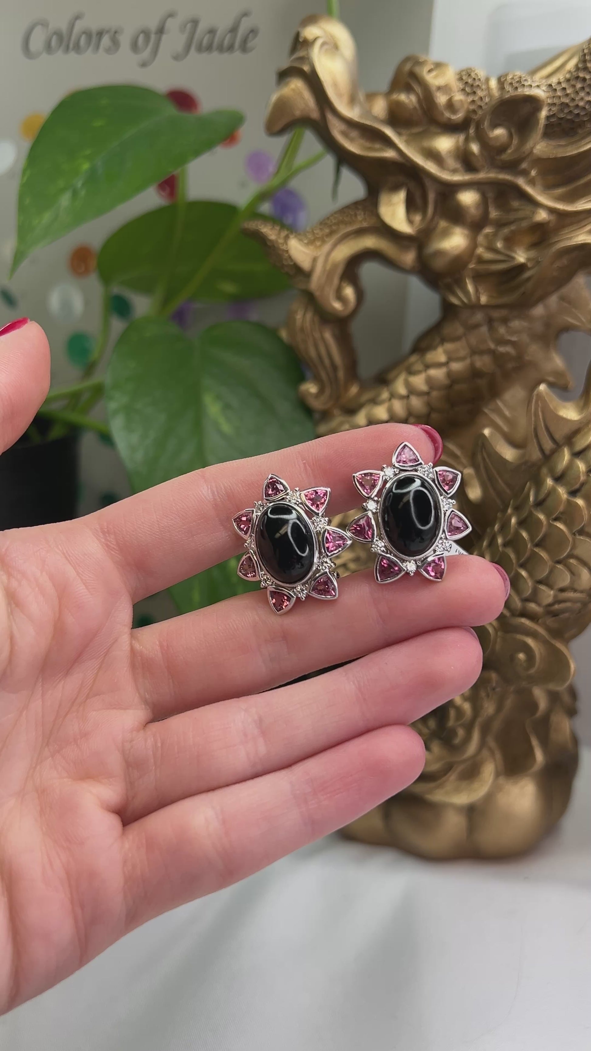 These authentic jade earrings for women have natural black jade color and trillion-cut pink tourmalines on 18K white gold Omega clip backs for pierced ears.
