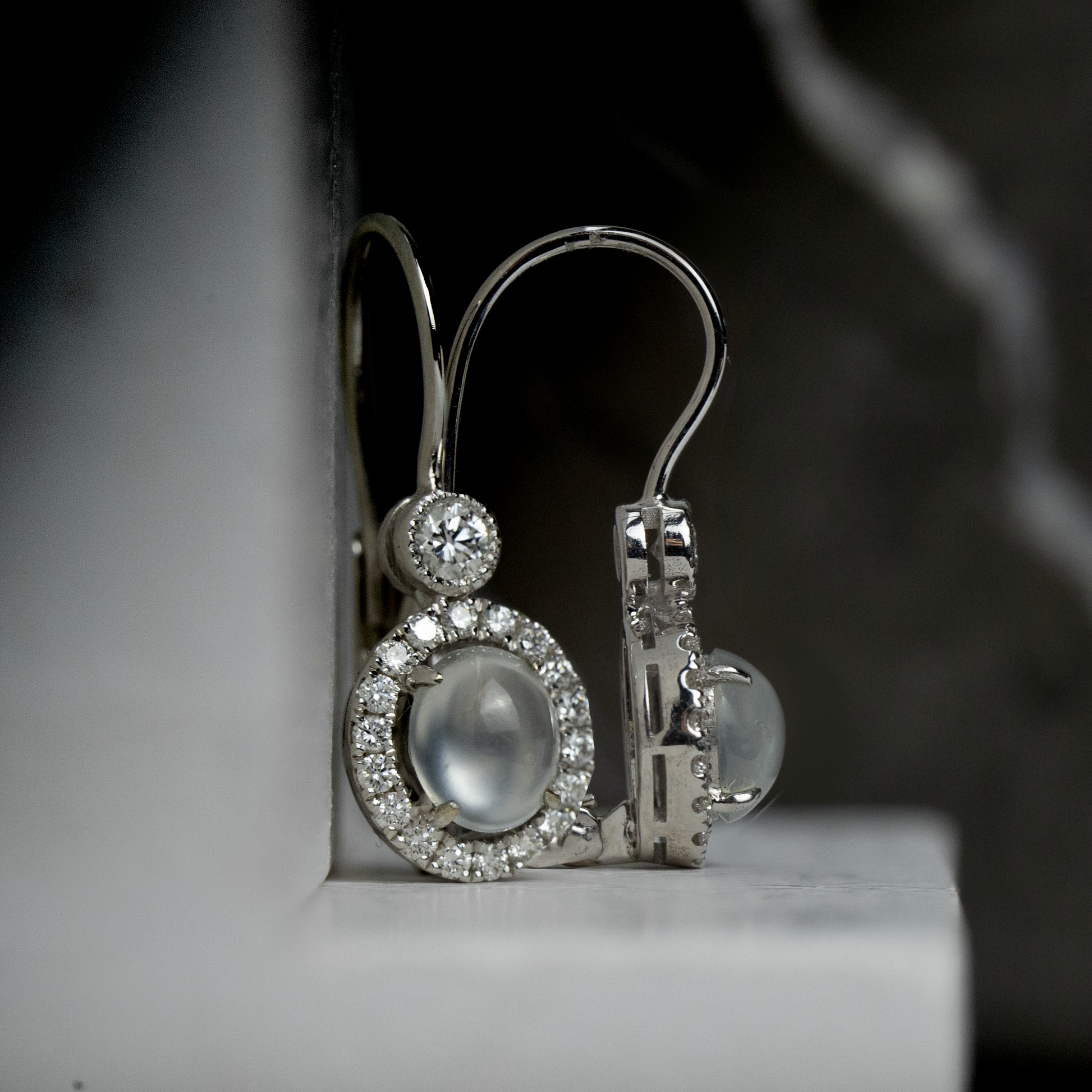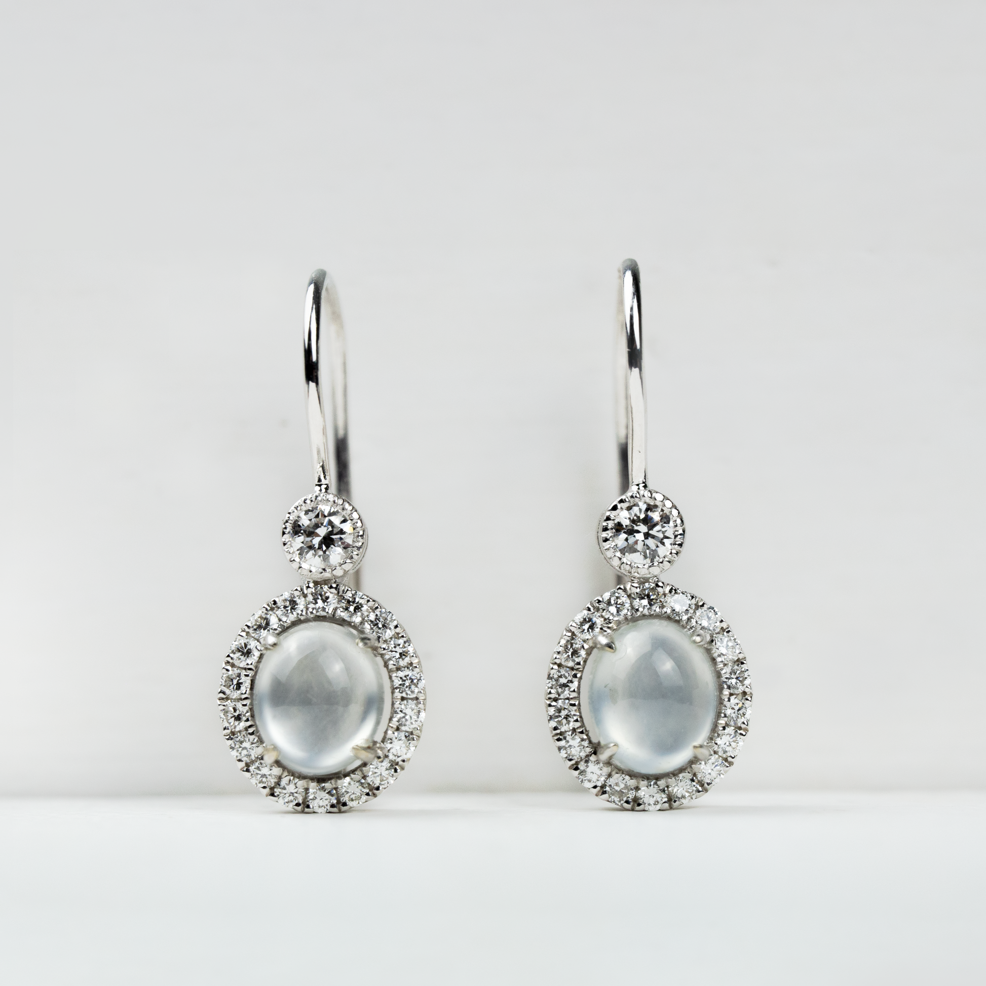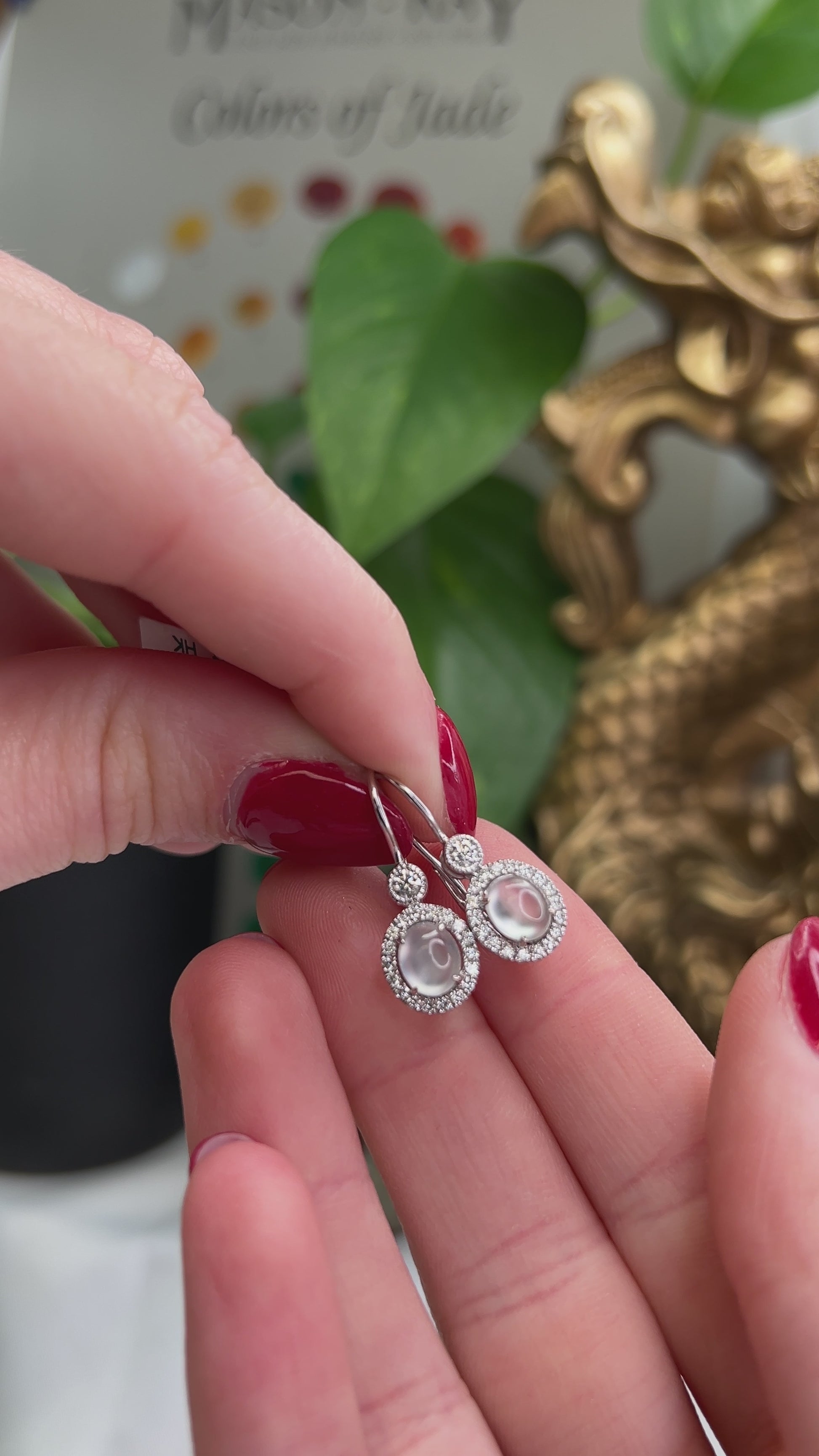 Stunning & Rare Designer Ice Jadeite Earrings! Fine ice jadeite jade oval cabochons set in18K white gold with diamond bezel & top - truly incredible jade gift! All Mason-Kay Jade Jewelry is Certified Natural Jadeite Jade. Gift Wrapped Too!