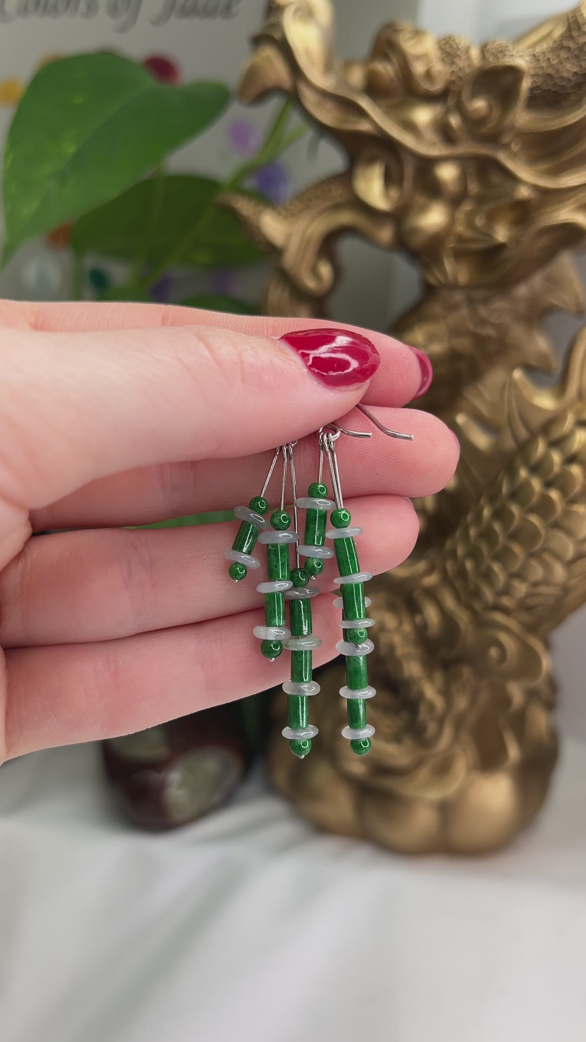 Designer drop earrings in 18K white gold featuring 3mm green jade round beads, ~2.5x4.5mm green jade cylinder beads, and ~5mm ice jade discs.