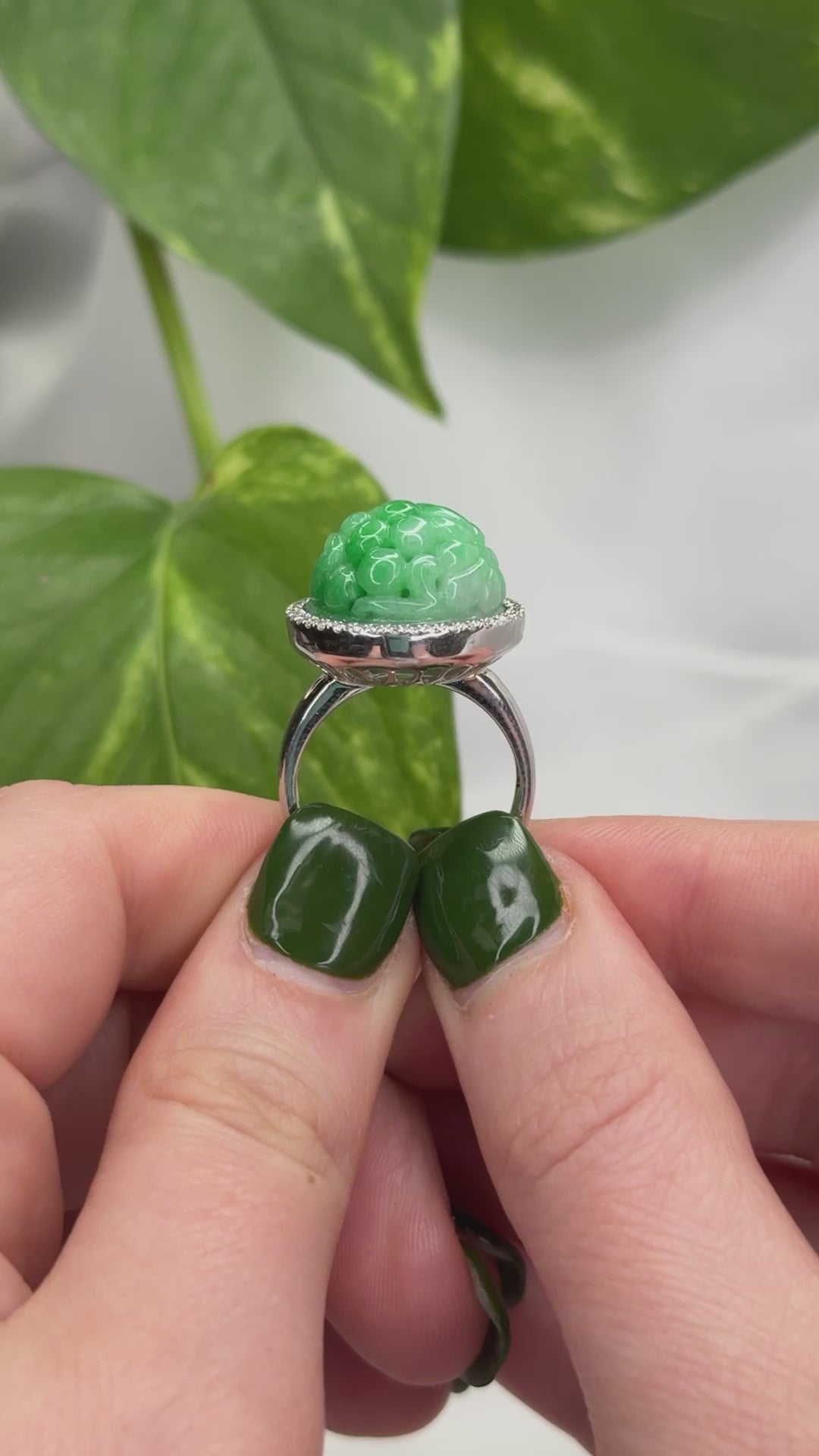 WOW! Stunning Designer Jade Ring. Vivid apple green jadeite jade round carved stone set in an 18K white gold mounting with diamond halo (.39ct tw). Finger size 7.25. Beautifully hand-carved with floral motif. A Jade Must Have. Certified Natural Jade.