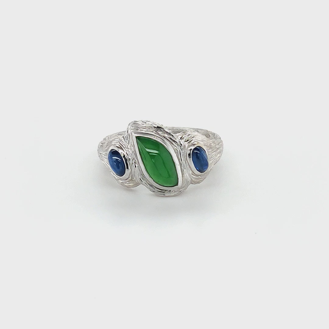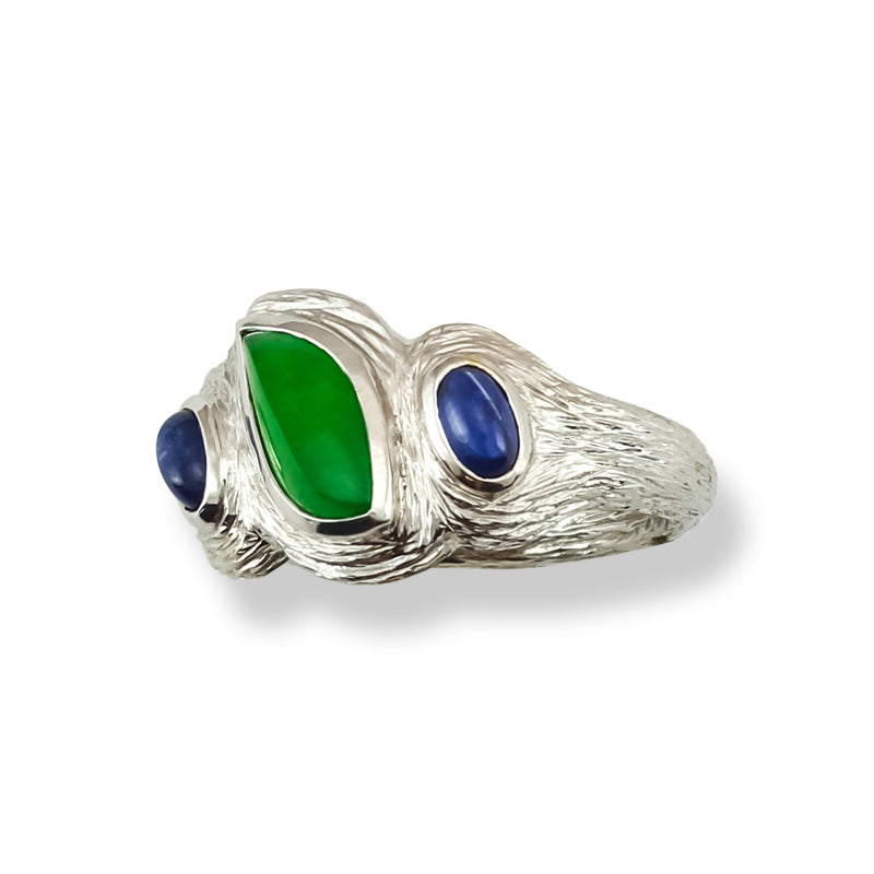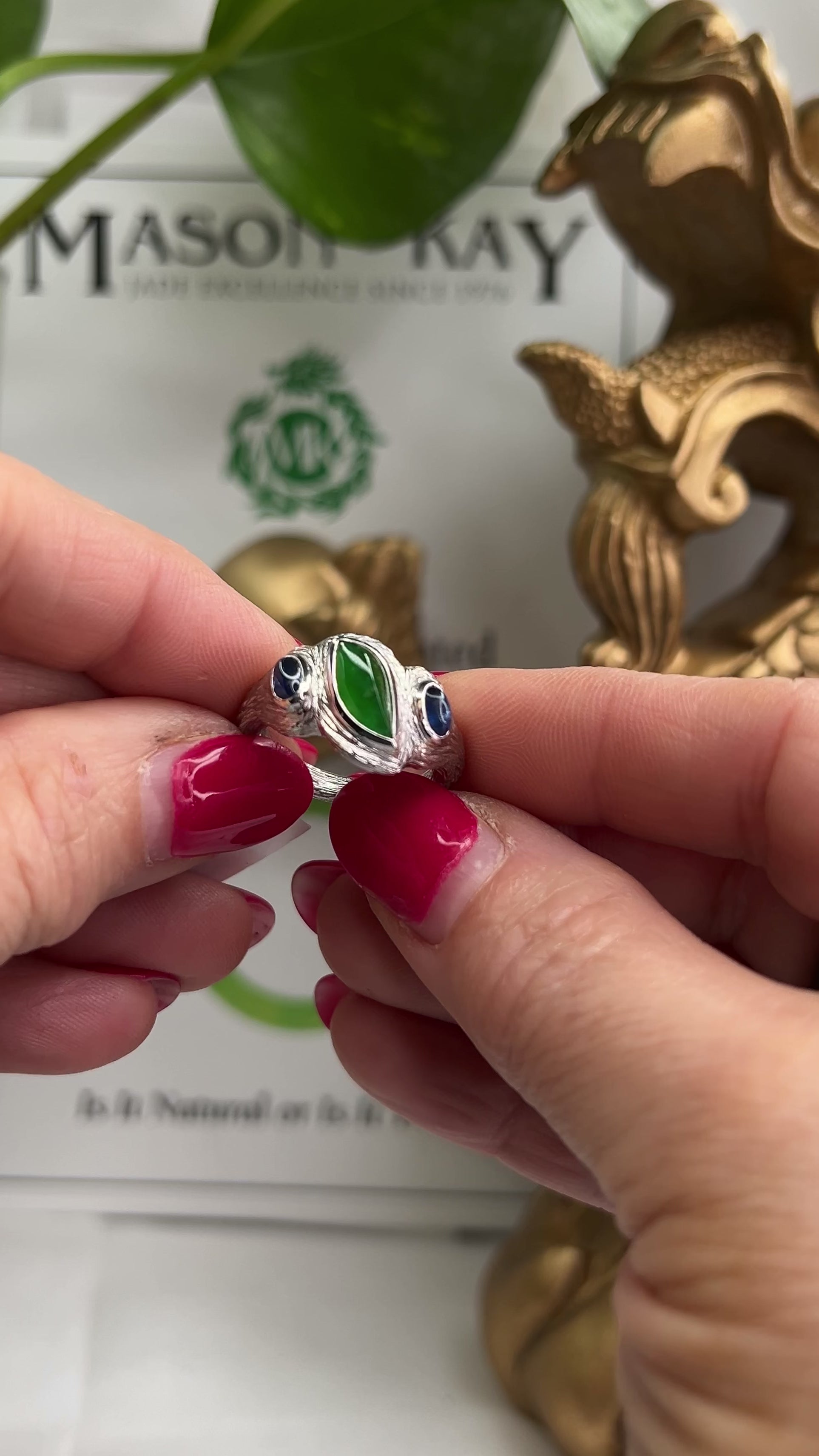This green jadeite jade ring for women is part of our Mason-Kay Designer Jade Collection. The translucent ridged fine green jadeite jade marquise center is set at a 45 degree angle and accented by two oval cabochon sapphire side stones. Shop natural jade rings from Mason-Kay Jade for your jade jewelry collection.