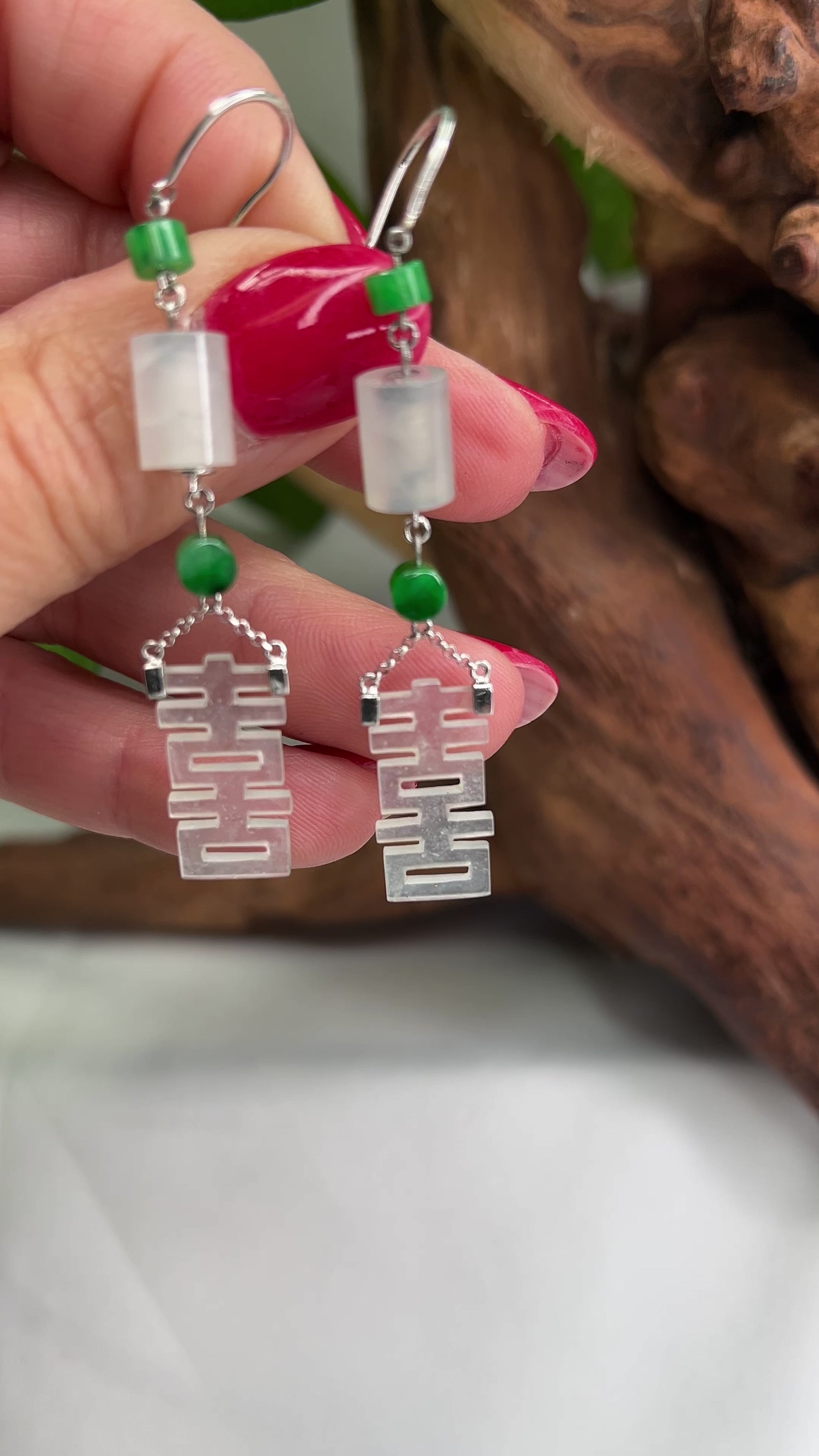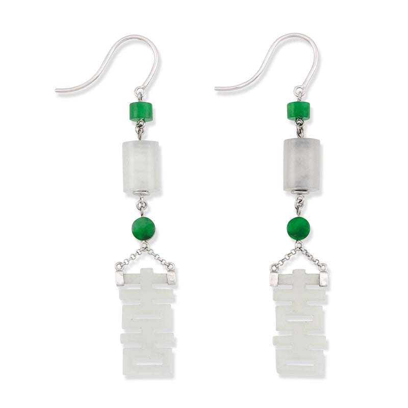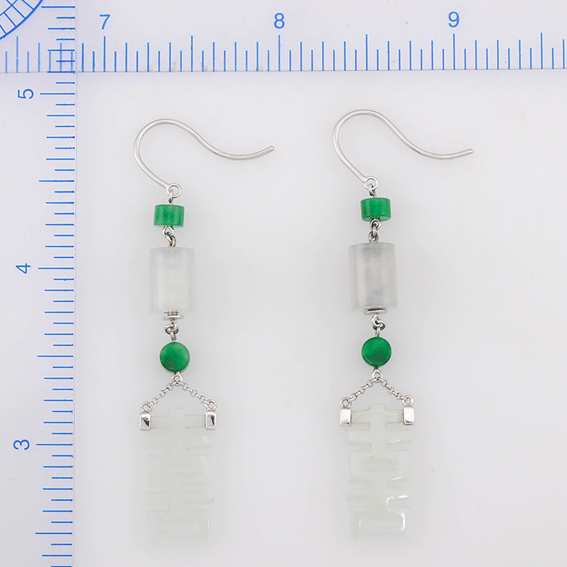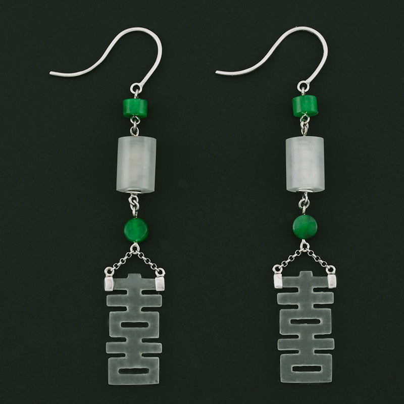 These designer ice jadeite dangle earrings feature carved ice jadeite happiness symbols with ice jadeite cylinder tops & green jadeite cylinder accents on 18K white gold shepherd hooks. All Mason-Kay jade jewelry is genuine type A Jadeite.