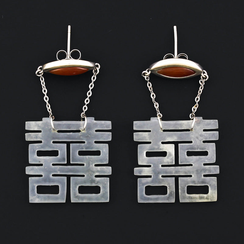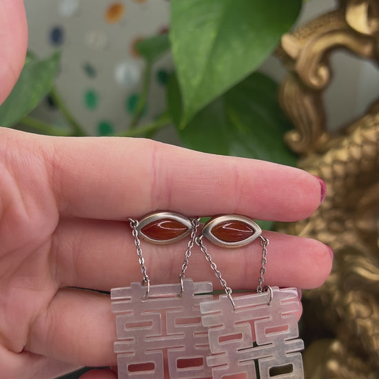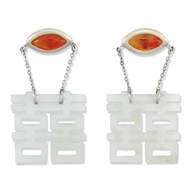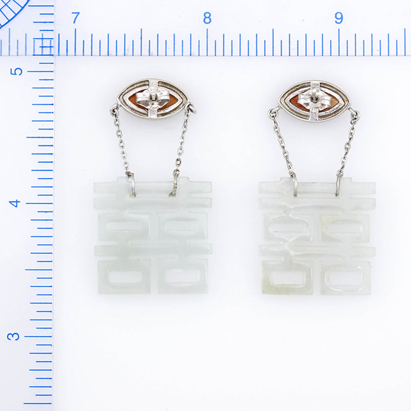 Mason-Kay carved ice jadeite double happiness screens suspened by 18K white gold chain from red jade marquise tops. Give the Gift of Double Happiness! Natural, untreated, Type A jadeite jade. Includes Certifiate of Authenticity & Gift Wrap!