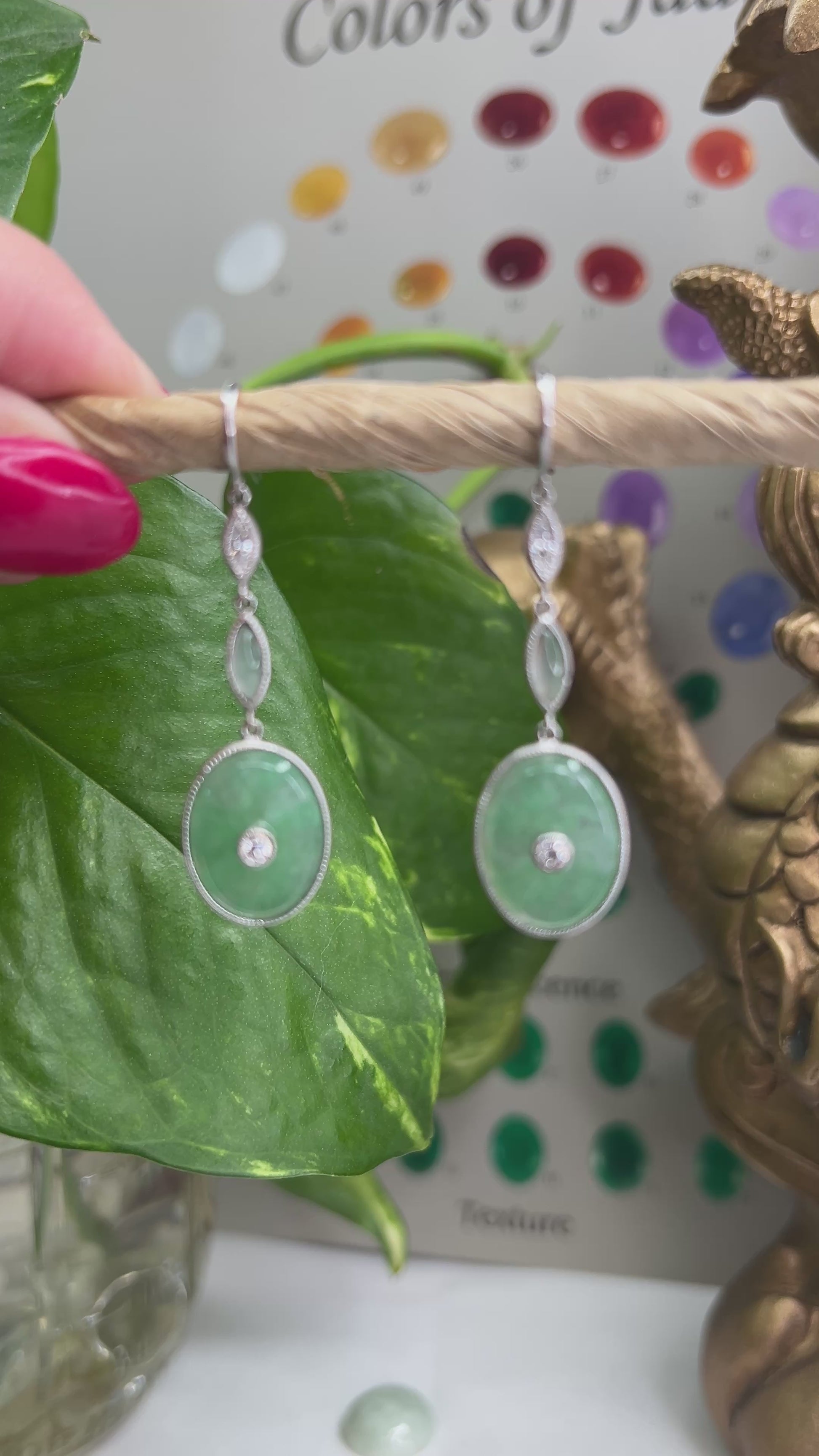 Dance into luxury with these playful green jadeite jade drop earrings! The translucent beveled oval jades wink with sparkling diamond centers, while marquise ice jade and diamond tops add a flirty finish. Dangling from 18k white gold shepherds hooks, these fun yet fabulous gems are sure to make your outfit pop with personality.