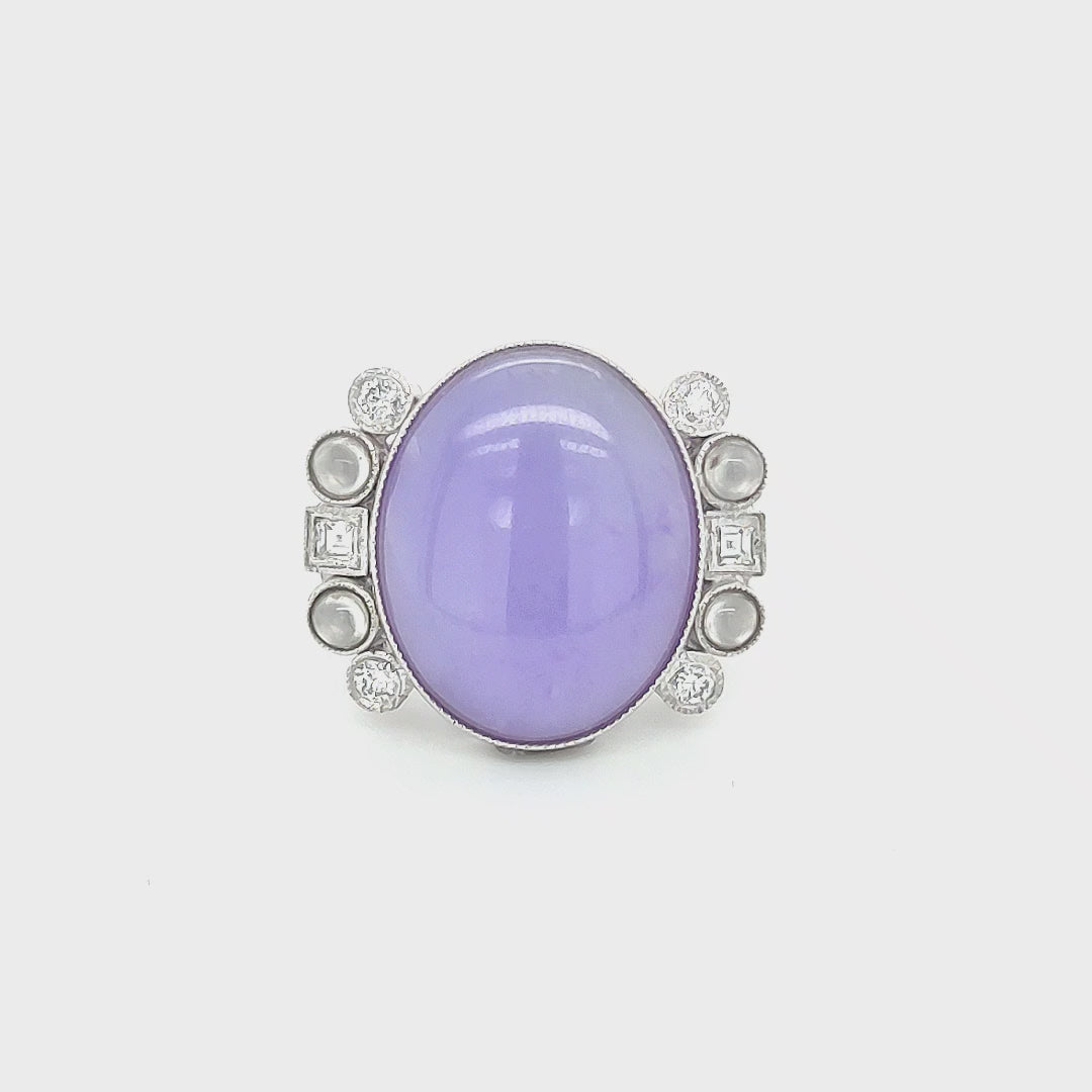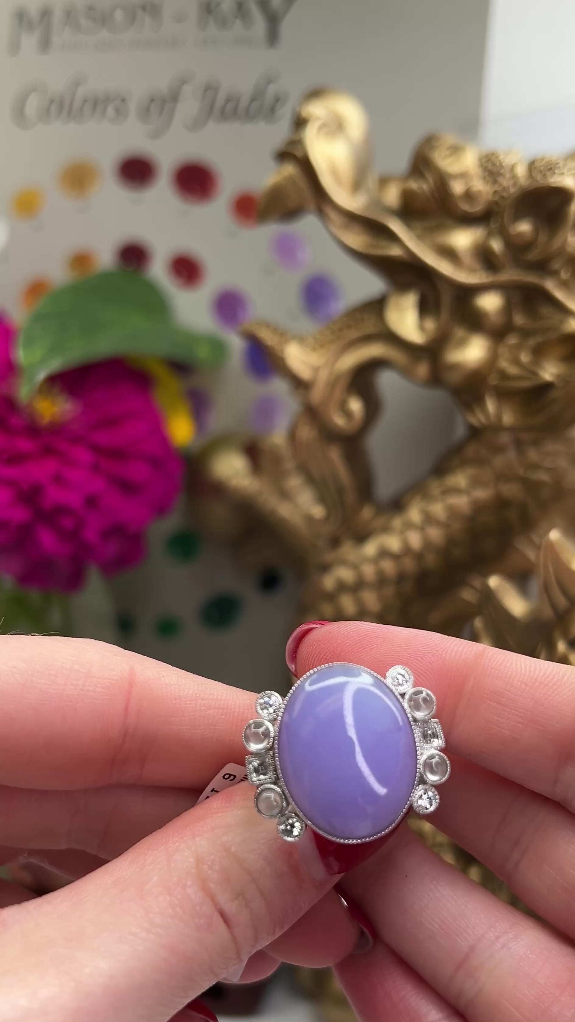 Straight out of our Designer Jade Jewelry Collection, this lavender jadeite jade ring for women features a fine oval cabochon center jade stone with four round ice jadeite jade cabochons and four diamond side stones (round and square cuts) set in bezels with milgrain.