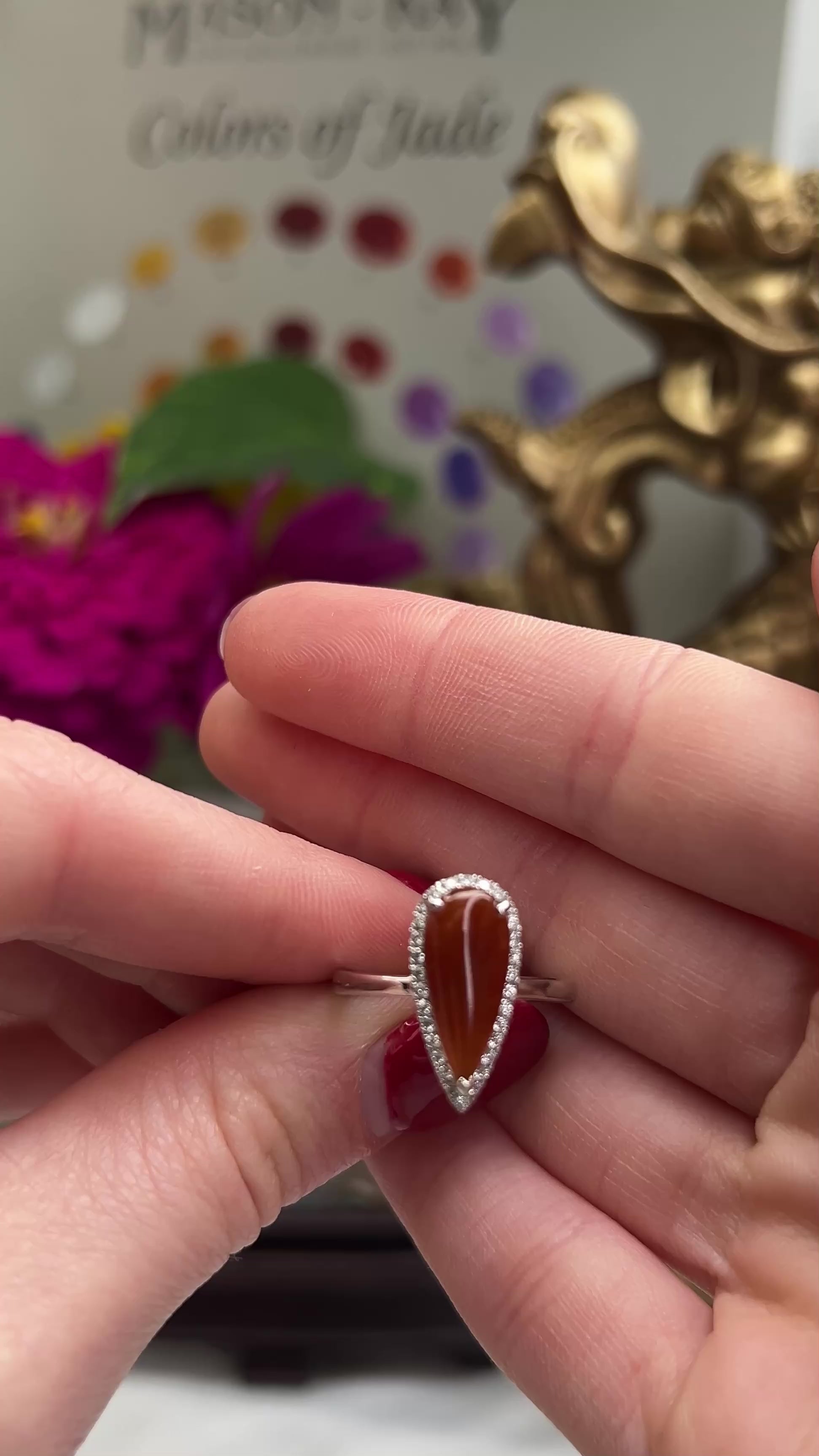 This amazing rich red jadeite jade pear shaped ring with a diamond halo is simply elegant. Finger size 7.5 in 18K yellow gold. Red represents good fortune & happiness. This stunning beauty would make anyone happy to add to their jewelry collection.