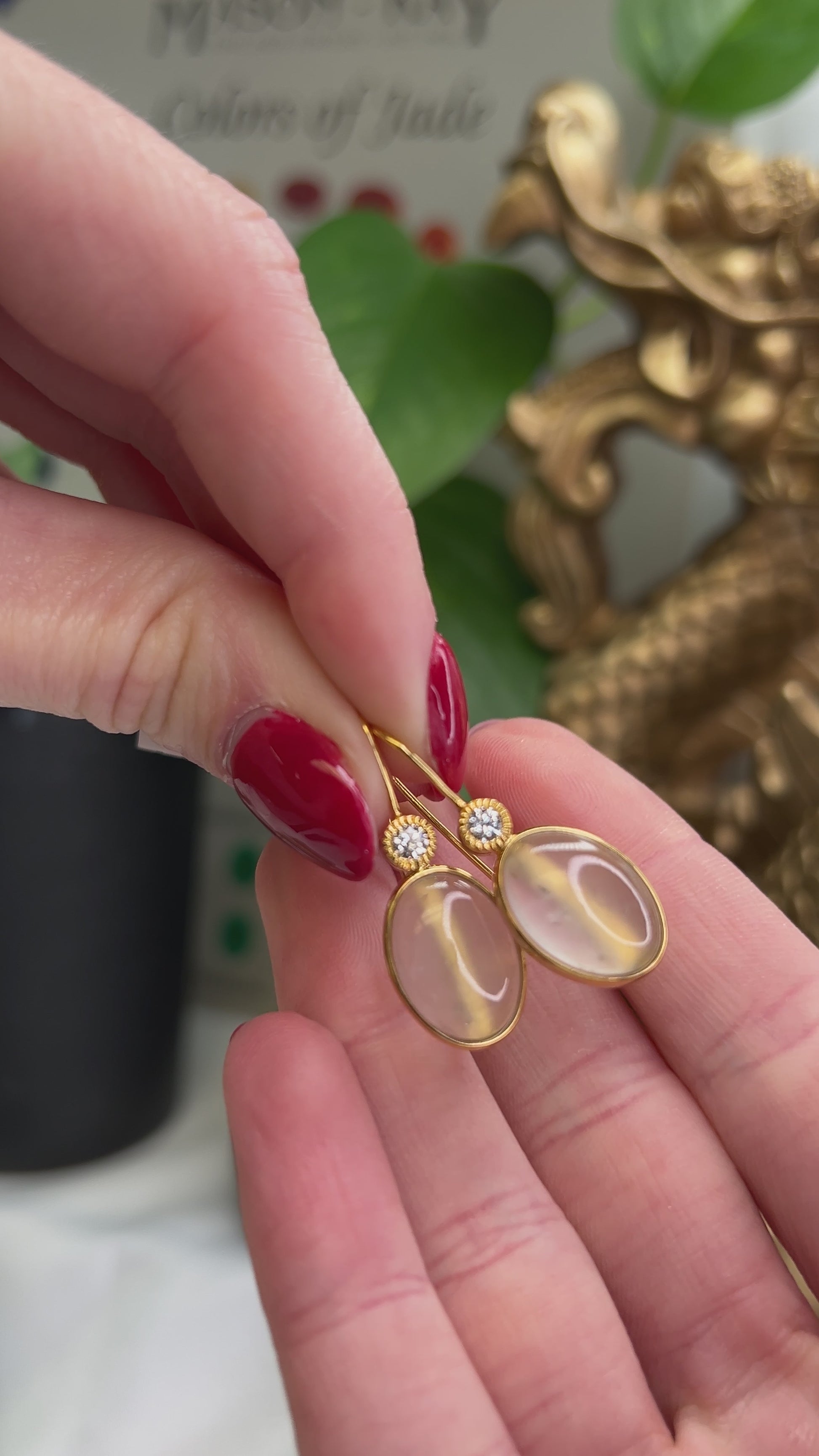 Beautiful ice jadeite jade oval bezel set cabochons with a round diamond top drop set on 18K yellow gold lever backs. Traditional style with a hint of modern flair. Great for daily wear and perfect for dress or casual attire. Shop natural jade jewelry from Mason-Kay Jade for your jade jewelry collection.