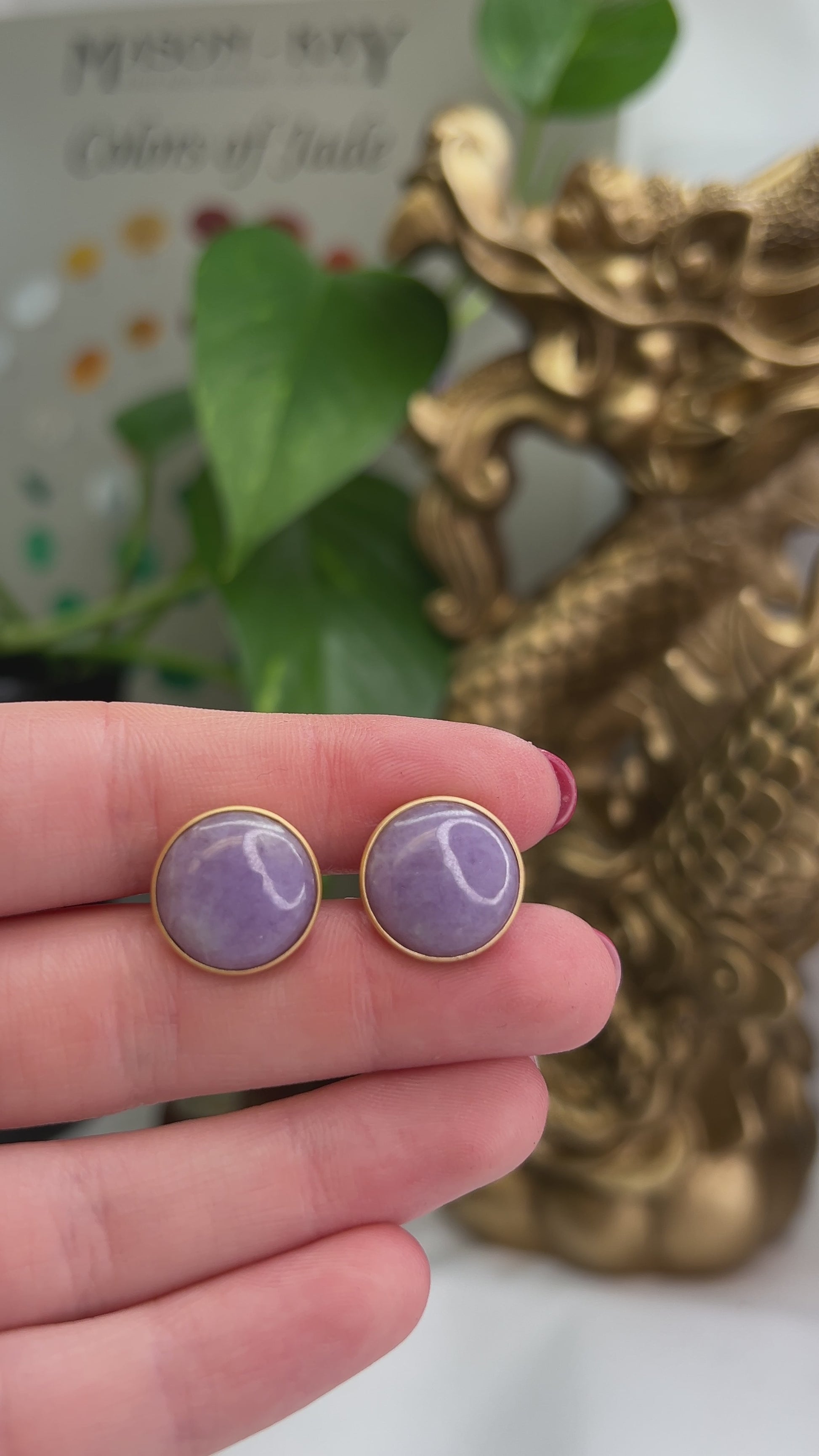 Gorgeous lavender jadeite jade round cabochon stud earrings set in a 14K yellow gold milgrain bezel. Durable enough for everyday wear! Natural, untreated, Type A jadeite jade. Guaranteed! Includes Certifiate of Authenticity & Gift Wrap!