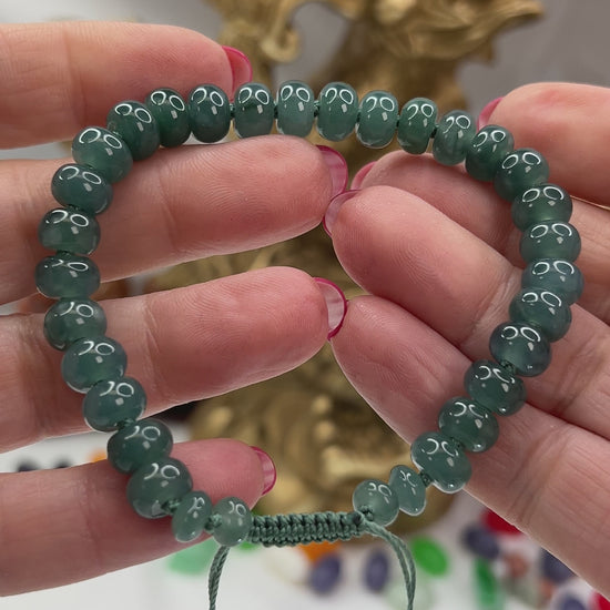 This Guatemalan blue green natural jadeite jade adjustable bracelet has amazing color & design. Thirty two roundel beads hand strung on a adjustable silky cord. Great fit for a medium to large wrist and hands.