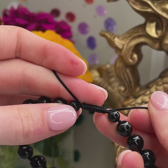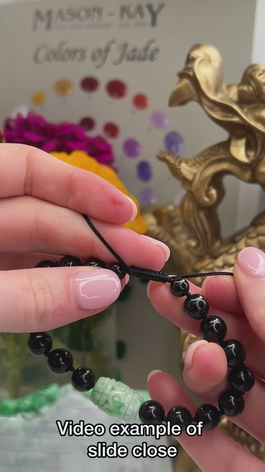 - Adjustable closure; knotted between beads on bonded nylon cord