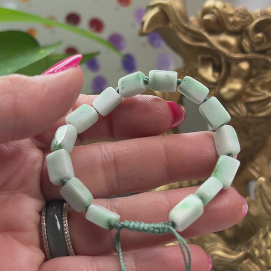 This elegant adjustable bracelet features fourteen polished rectangular block jadeite jade beads in soothing green shades. Designed to comfortably fit small to medium wrists, it offers a striking yet gentle look.