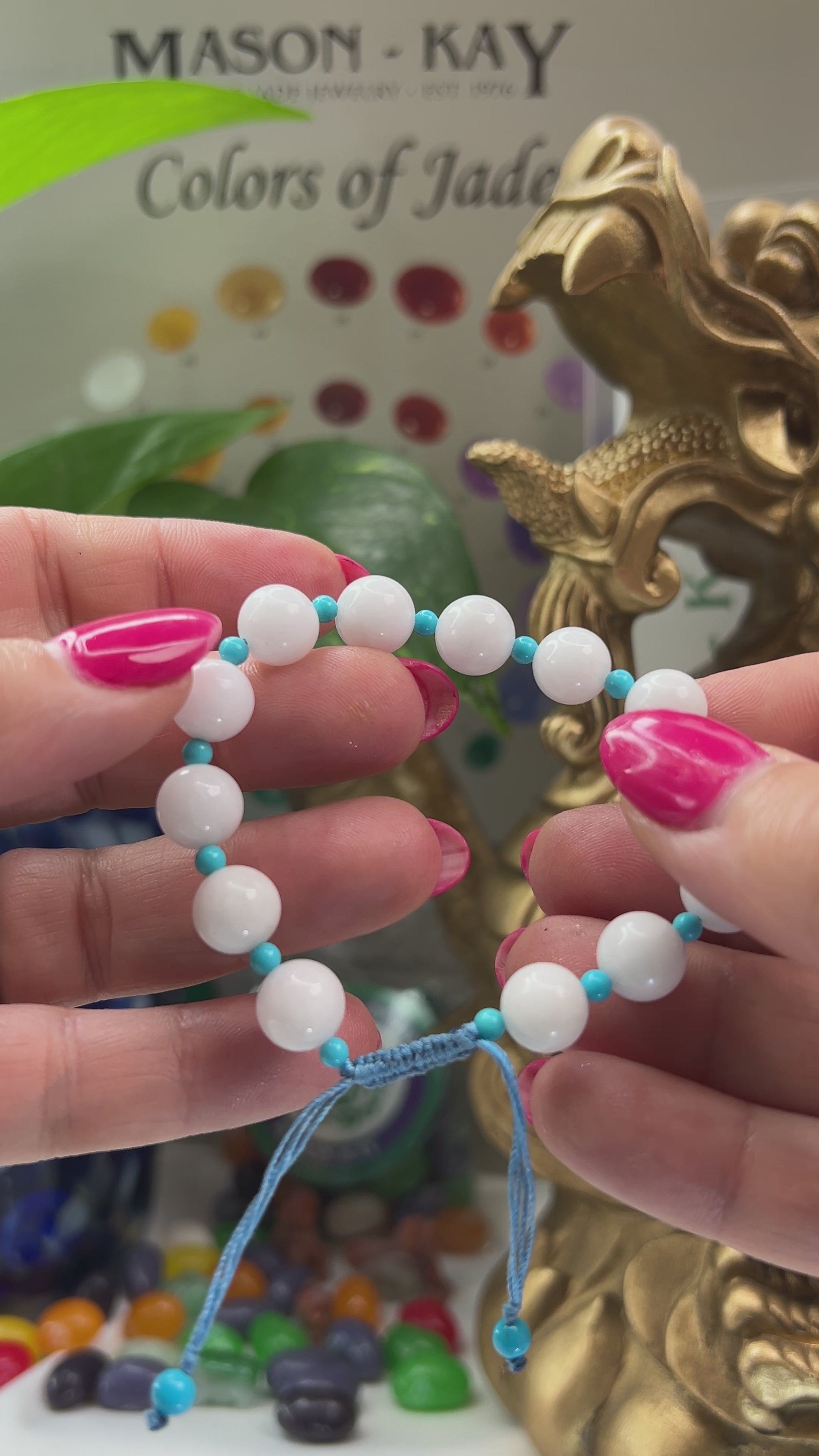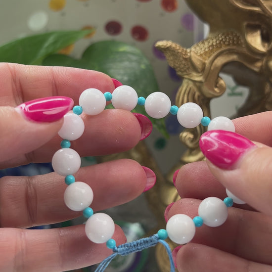 hirteen white jadeite jade beads separated by Sonoran turquoise micro-beads, all strung on a blue adjustable pull cord with two turquoise beads at the ends. Designed to fit small to medium wrists comfortably.