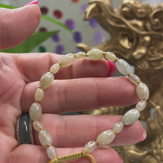 This chic jadeite jade bracelet displays nineteen light yellow lotus beads, alternating between large and small, on a smooth adjustable pull cord. Made to fit small to medium wrists comfortably, it’s perfect for everyday wear.