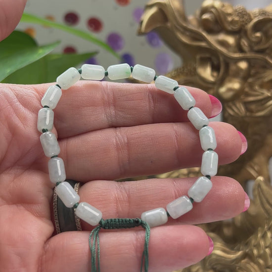 This stylish jadeite jade bracelet features eighteen light green unique cylinder beads strung on a smooth adjustable pull cord. Designed to comfortably fit small to medium wrists, it’s ideal for daily wear.