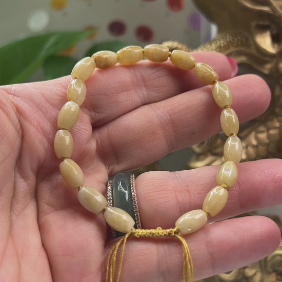 This stylish and fun jadeite jade bracelet displays eighteen yellow lotus beads, on a smooth adjustable pull cord. Made to fit small to medium wrists comfortably, it’s perfect for everyday wear.