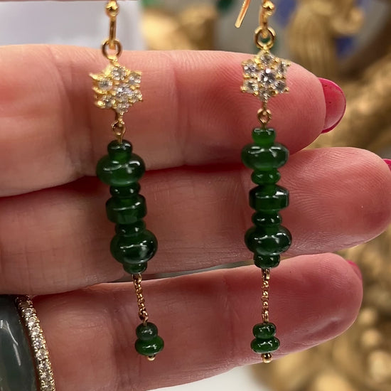 Translucent blue-green Guatemalan jadeite jade alternating abacus and roundel beads with a diamond snowflake top and tassel bottoms, on 18K yellow shepherds hooks. Shop natural jade jewelry from Mason-Kay Jade for your jade jewelry collection.