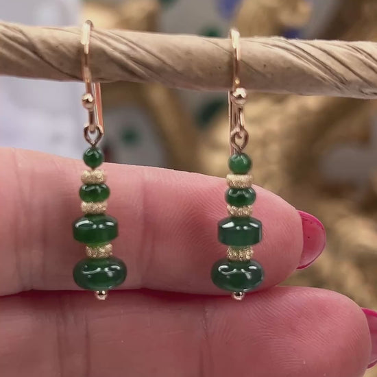 Translucent blue-green Guatemalan jadeite jade graduated abacus and roundel bead drop earring, with 18K yellow stardust gold roundel accents and shepherds hooks. Shop natural jade jewelry from Mason-Kay Jade for your jade jewelry collection.
