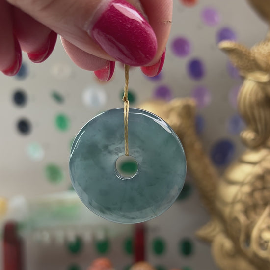 This blue-green Guatemalan jadeite jade Pi disc (pronounced 'bee') has a blue-green color with snowflake spots. This jade disc for men and women can be worn on a variety of styles of chain or cord. This jade stone has natural green color.