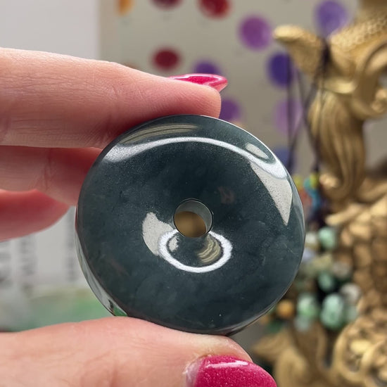This blue-green Guatemalan jadeite jade Pi disc (pronounced 'bee') has a medium bluish grey color with a dark green shading and a classy flat edge. This jade disc for men and women can be worn on a variety of styles of chain or cord. This jade stone has natural green color.