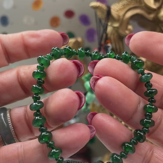 Translucent fine blue green jadeite beads hand strung & knotted with alternating larger and smaller roundel beads an adjustable slide closure making it easy to wear with your watch or layered! For a medium to large size wrist & hand. All orders include our Certificate of Authenticity.