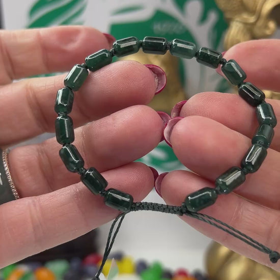 This stylish adjustable bracelet features eighteen polished cylindrical dark blue green jadeite jade beads. Designed to comfortably fit small to medium wrists, it combines boldness with refined style.