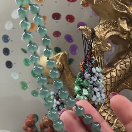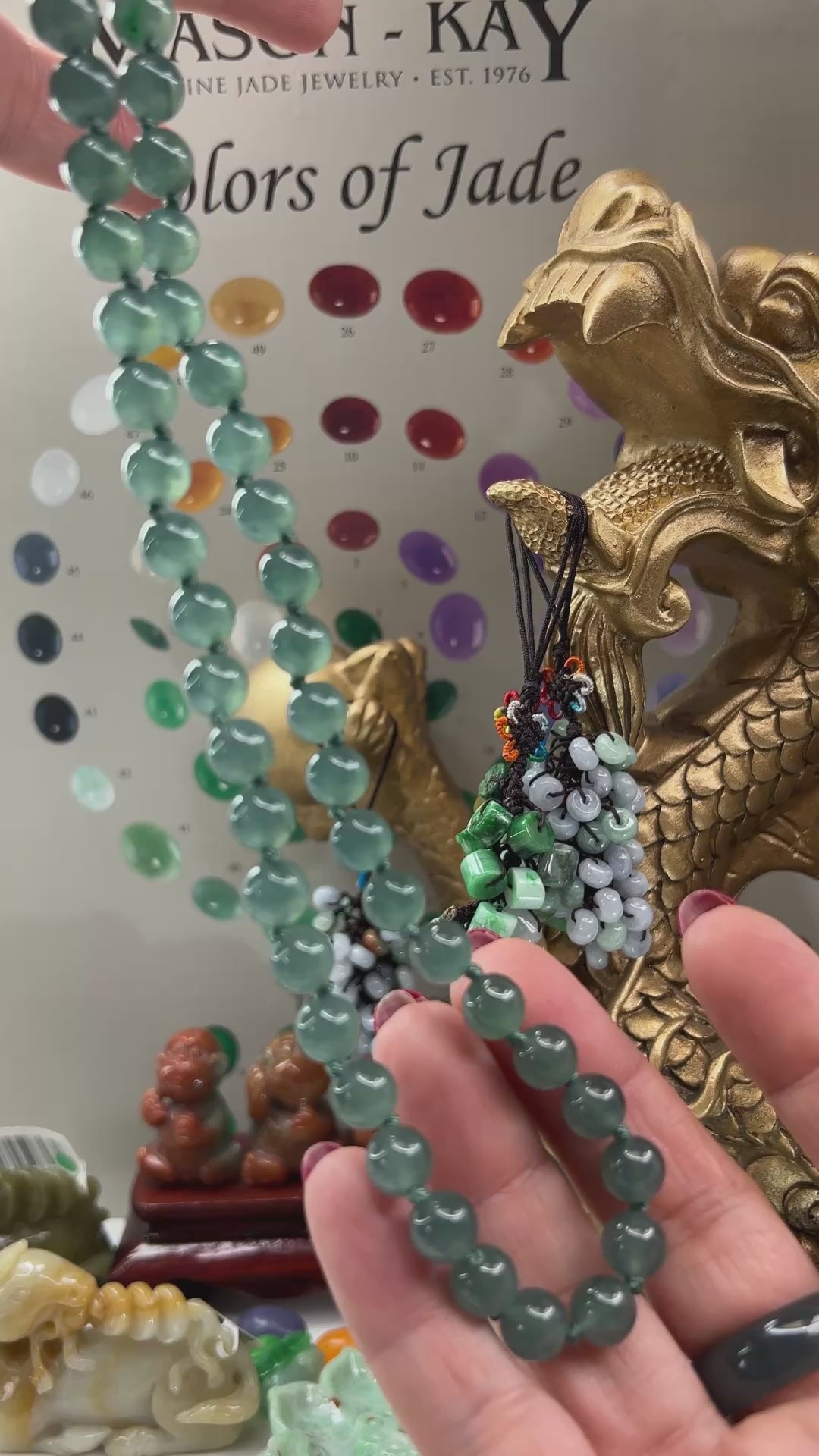 This blue-green jadeite jade bead necklace features 88 matched 7.7mm Green translucent beads strung on a smooth adjustable cord. Its translucent beauty makes it a striking accessory for both men and women, easily complementing casual or formal outfits.