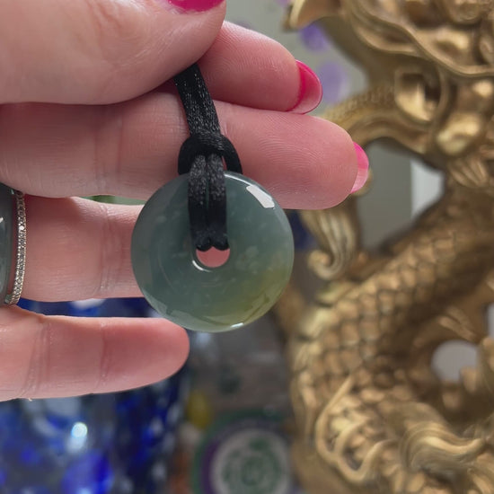 This exquisite blue-green jadeite jade donut necklace showcases striking blue-green shades accented with delicate white snowflake patterns and a distinctive yellow section, all suspended on an adjustable silky black cord. It makes a wonderful gift and a stylish choice for everyday wear.