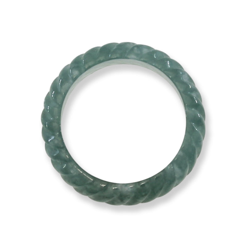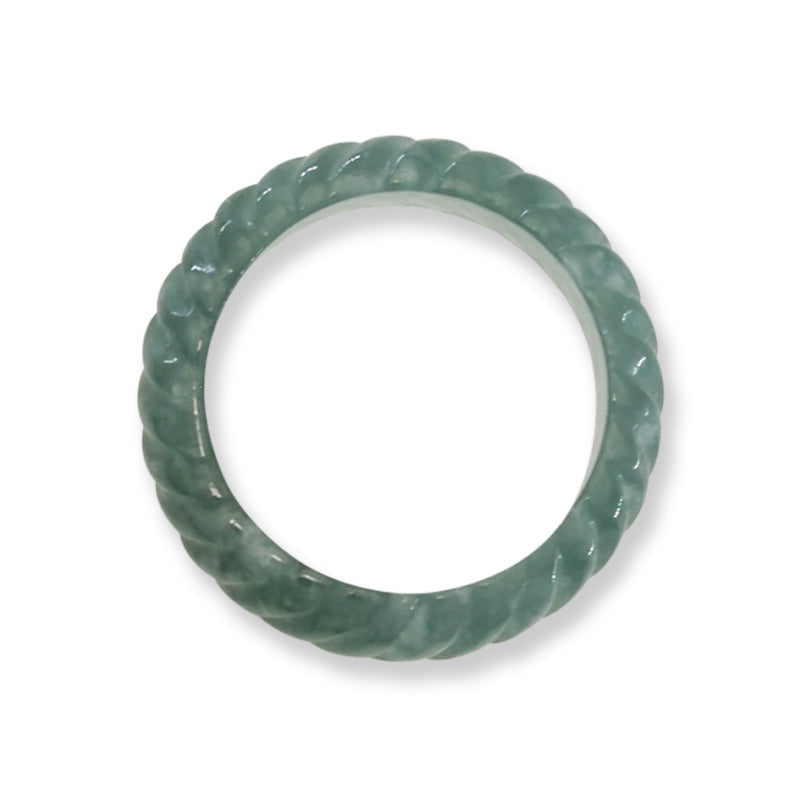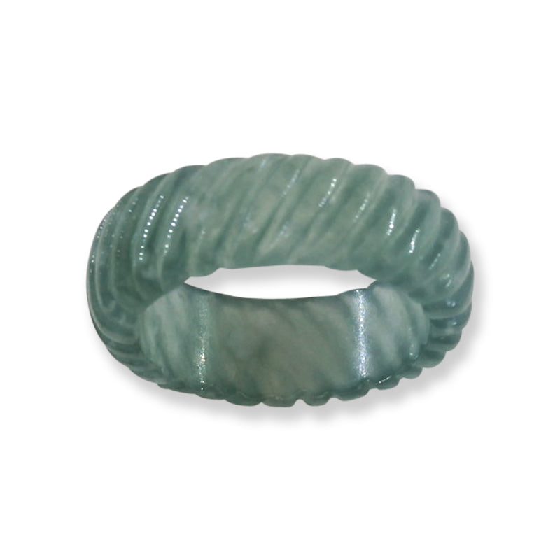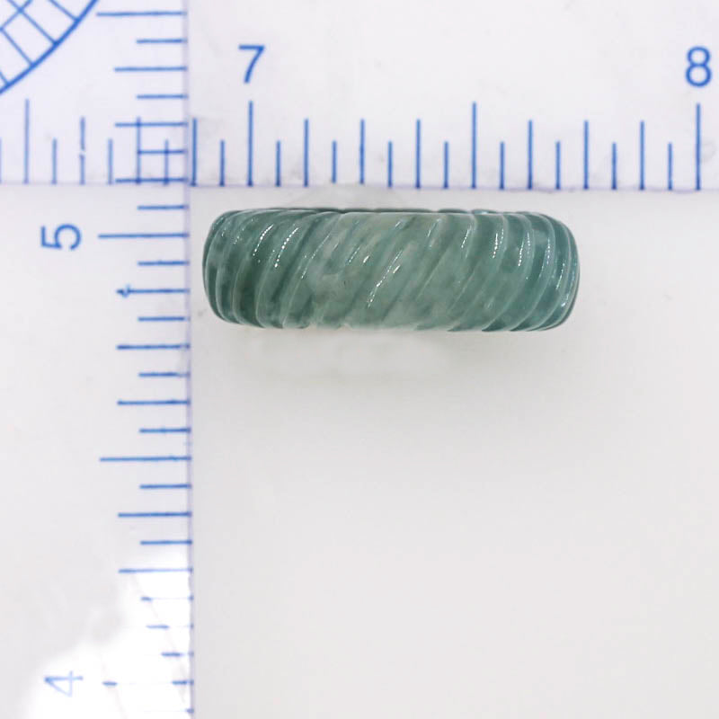 This blue-green jadeite jade band from Guatemala features a finely ribbed carved design, perfect for both men and women. Its translucent quality creates a dynamic appearance that changes with the light, highlighting the stone's natural beauty. Crafted from highly translucent jade, this ring offers increased durability while maintaining elegance—an exceptional piece to treasure with thoughtful care. Do not drop on cement or tile.
