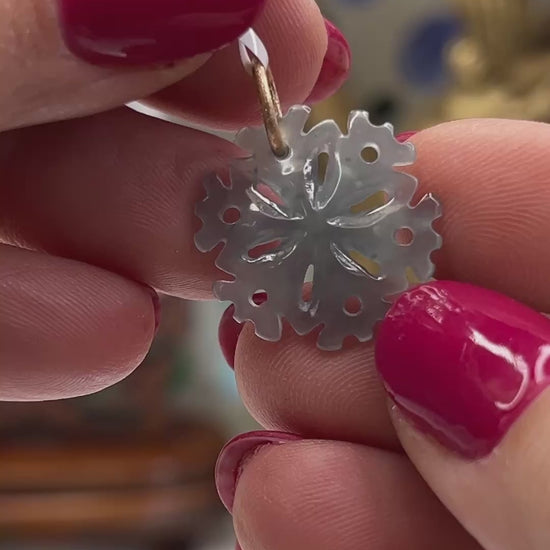 Crafted from authentic Guatemalan jadeite, this pendant features mesmerizing blue-green hues set in 14K yellow gold satin finish. The carved snowflake emanates a translucency that dance with light. Beyond its elegant design, this piece serves as a tactile worry stone, offering both visual beauty and a calming presence. A versatile accessory that honors jade's ancient heritage.